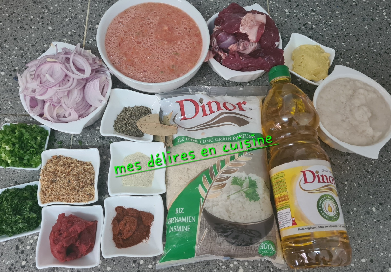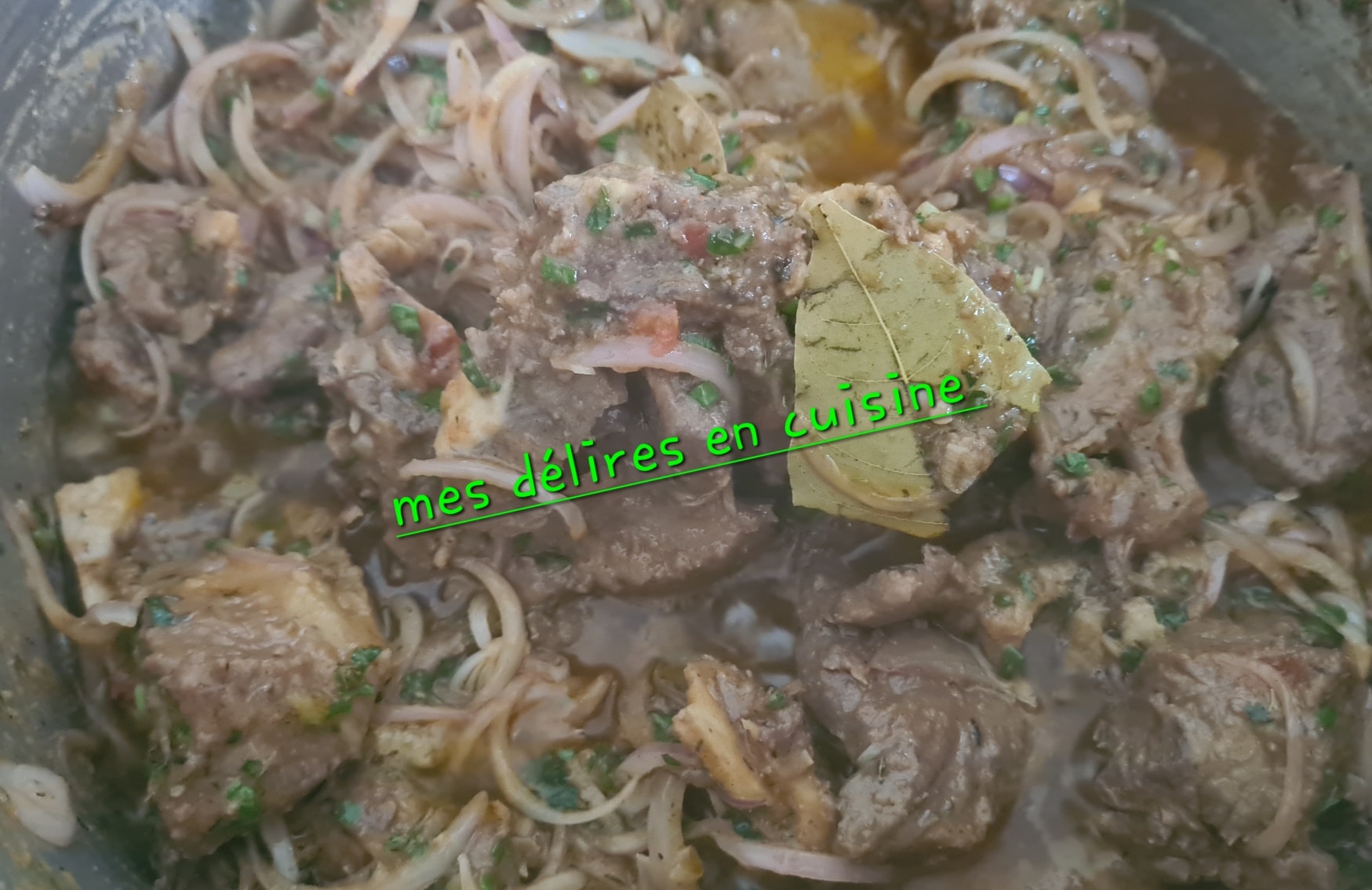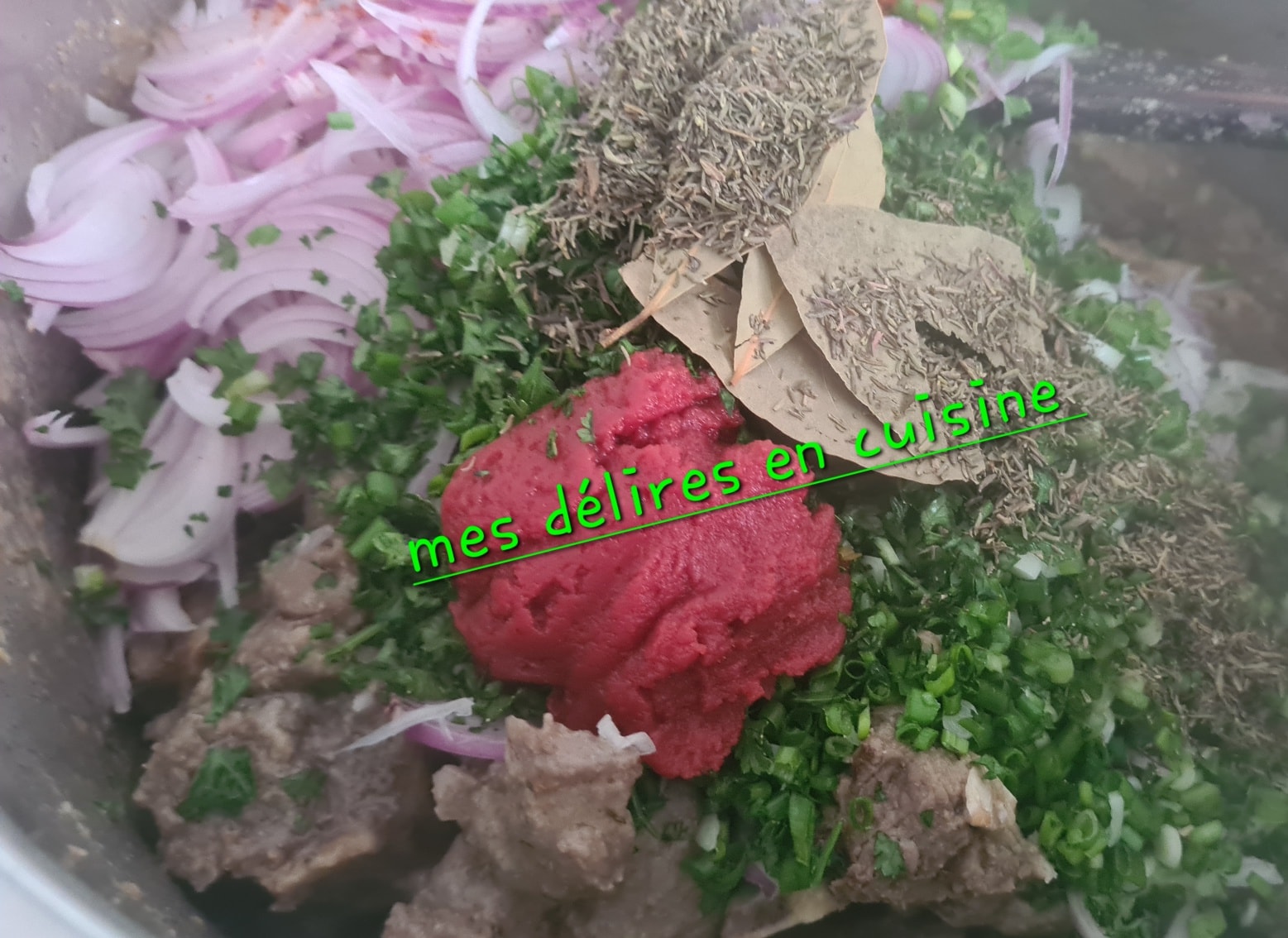 Ajouter la tomate concentrée ,les feuilles d’oignons, le thym et les feuilles de laurier