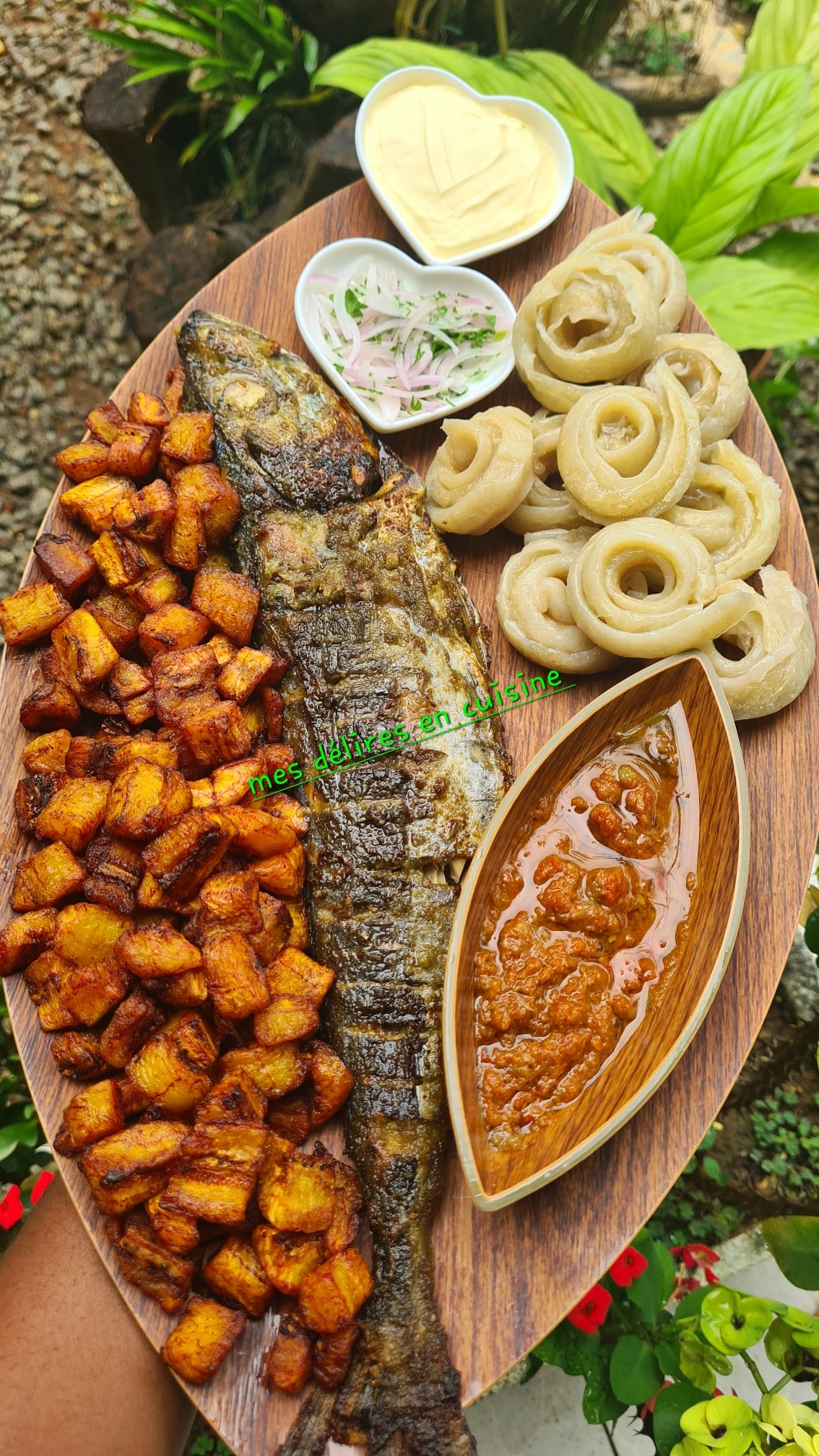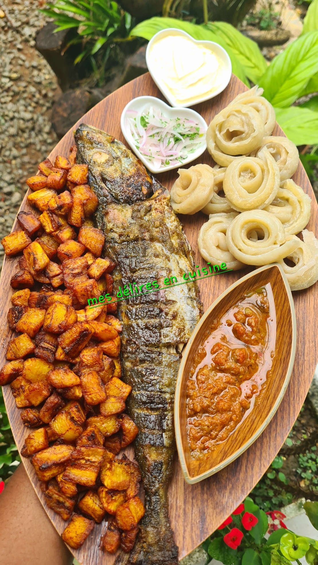 Accompagnement au choix:frite de plantain,miondo,frite d’igname, pommes de terre.