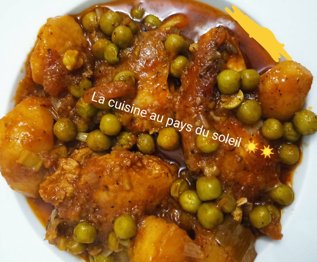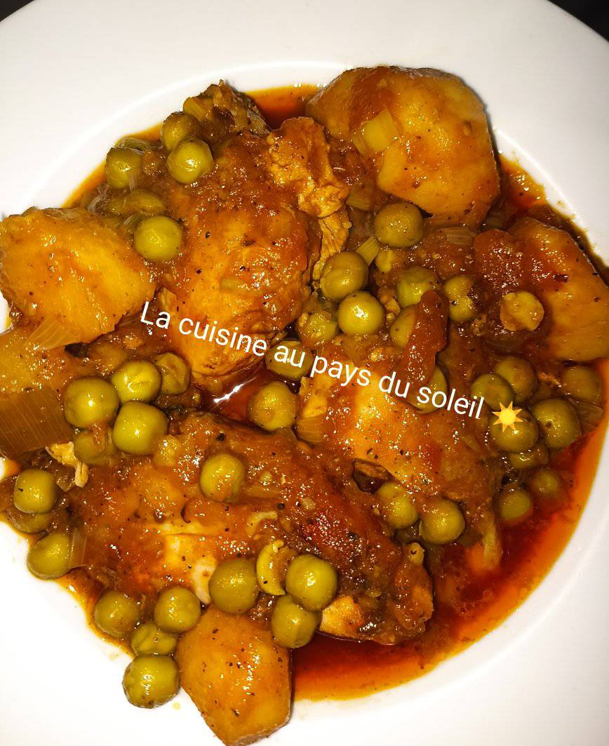 - Rajouter les pommes de terre frit légèrement dans la sauce , petit pois, le poulet et 2verres d’eau. Laisser bouillir 5min et c’est prêt.