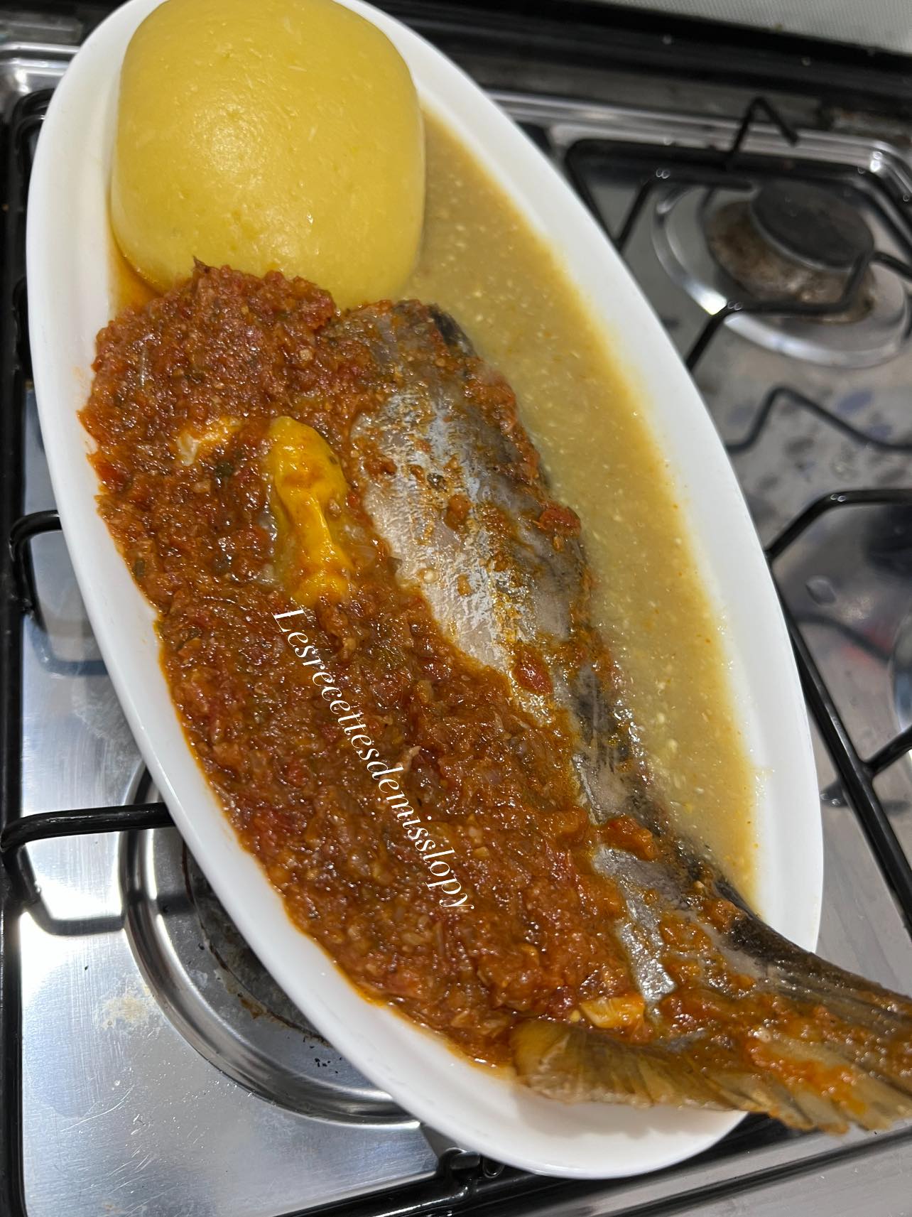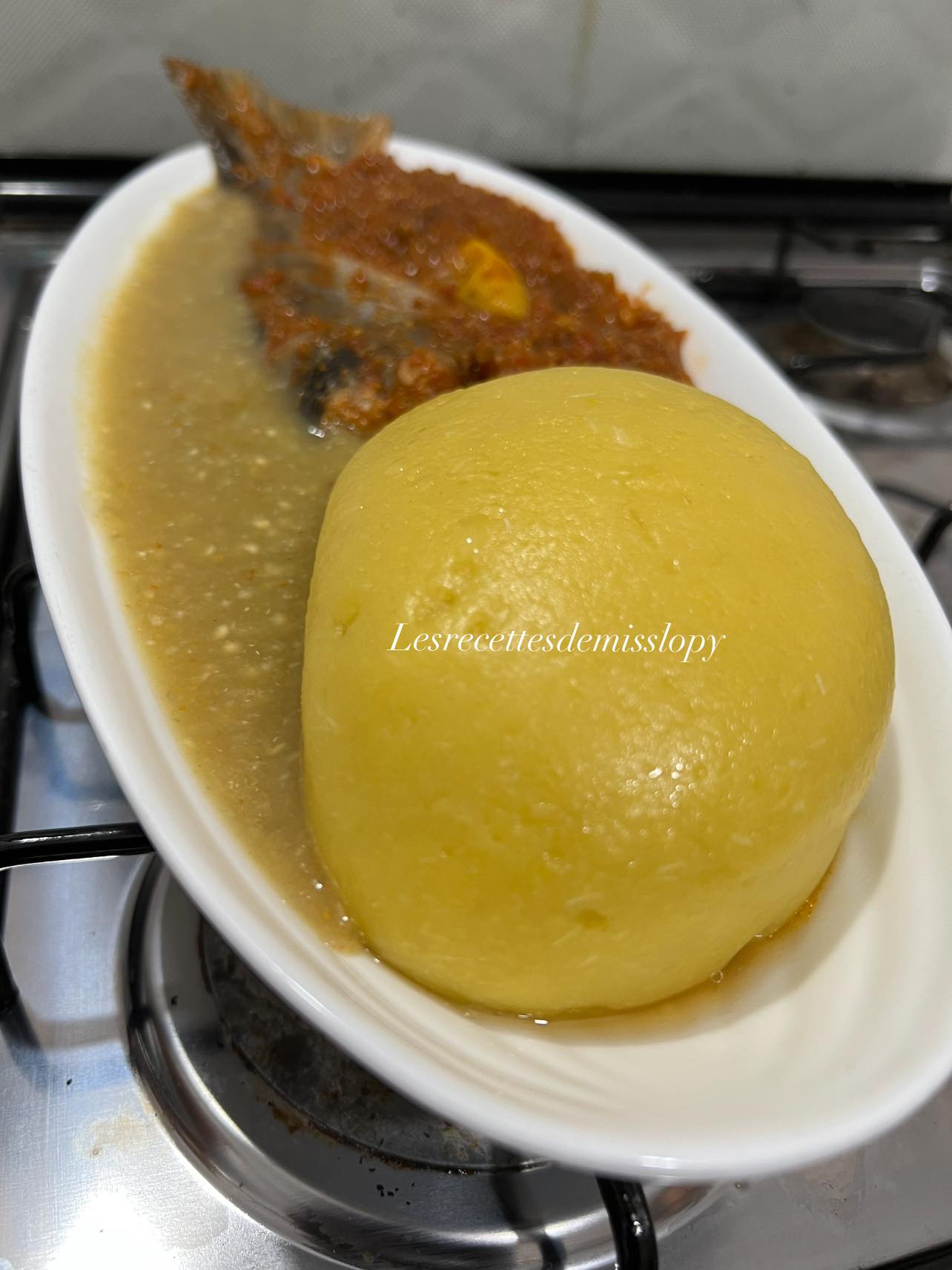 - C’est prêt servir avec du FOUTOU ( plantain + manioc cuits et ensuite pilé afin d’obtenir une belle boule homogène ) ou du riz nature.