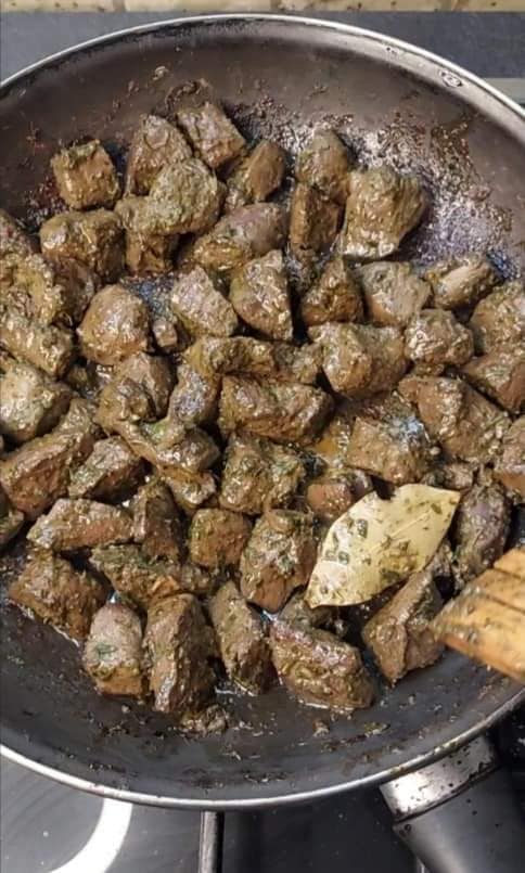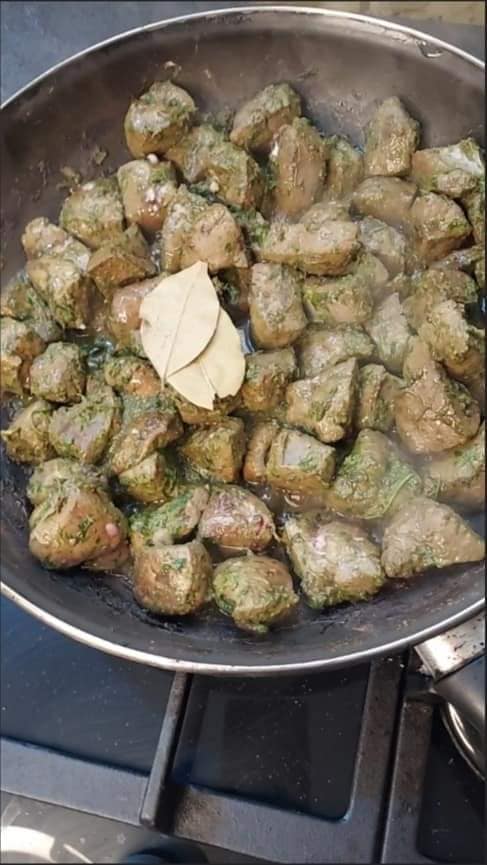- Incorporez les morceaux de foie marinés et les feuilles de laurier. Faites cuire en remuant régulièrement pendant environ 10 minutes, jusqu’à ce que le foie soit bien cuit mais encore tendre.