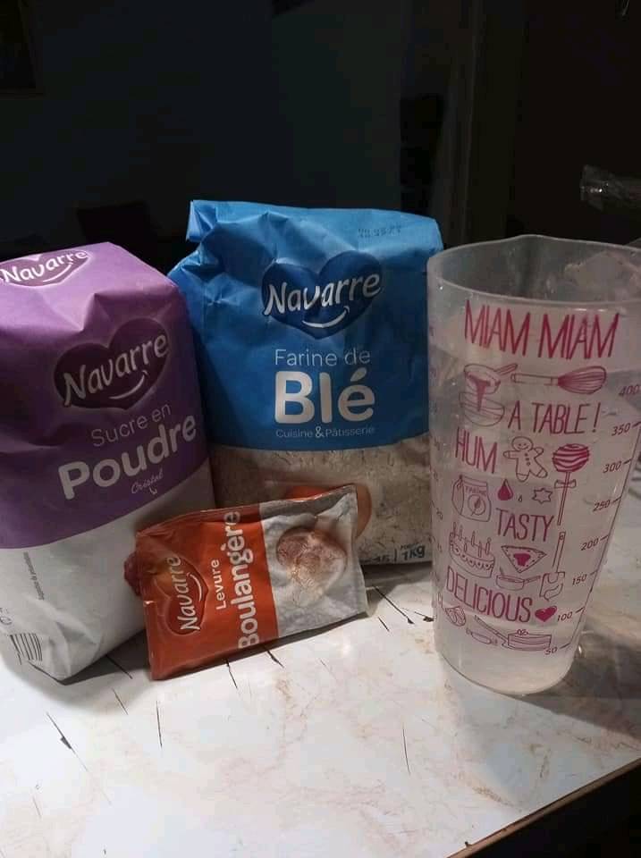 - Dans un bol mélanger eau tiede +levure et la moitie du sucre et laisser reposer 15mn.