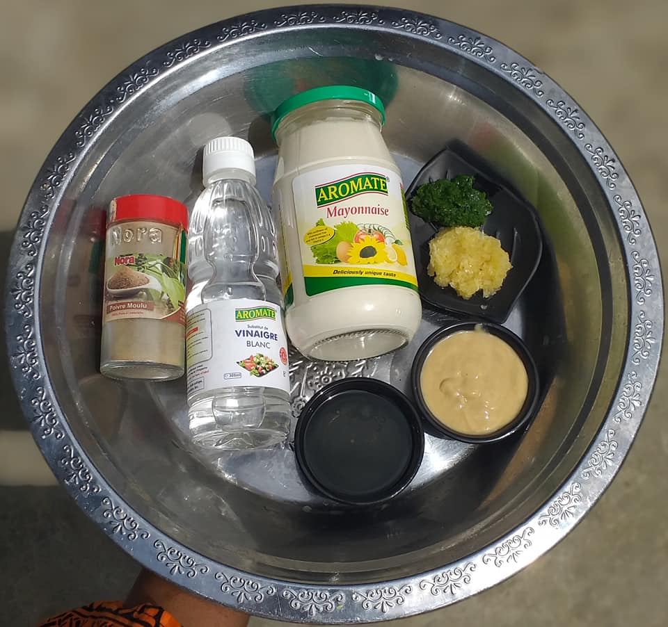 - Dans un bol, mélangez la mayonnaise, la moutarde, l’huile, le vinaigre.