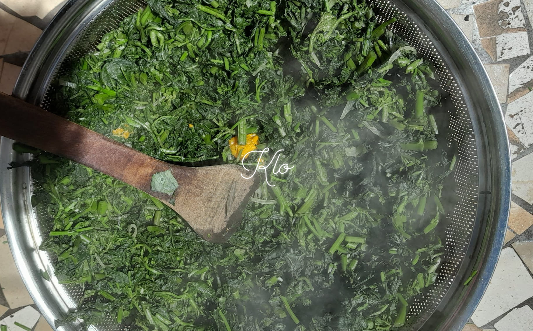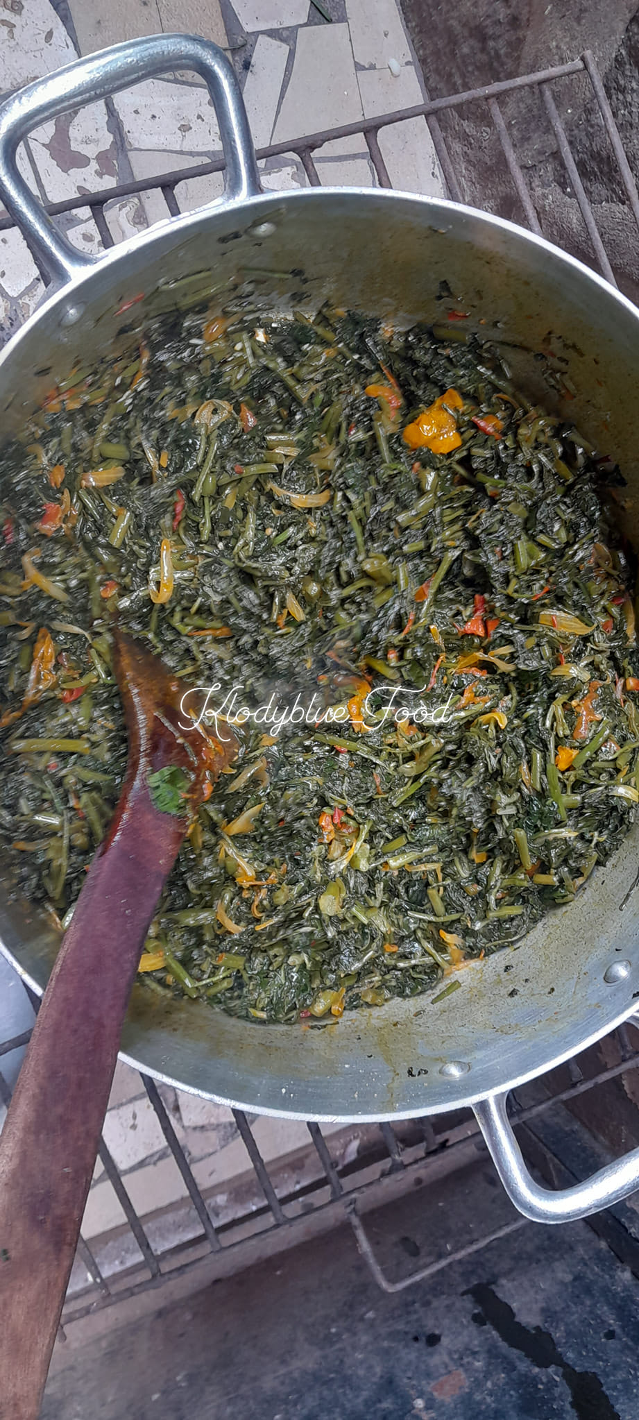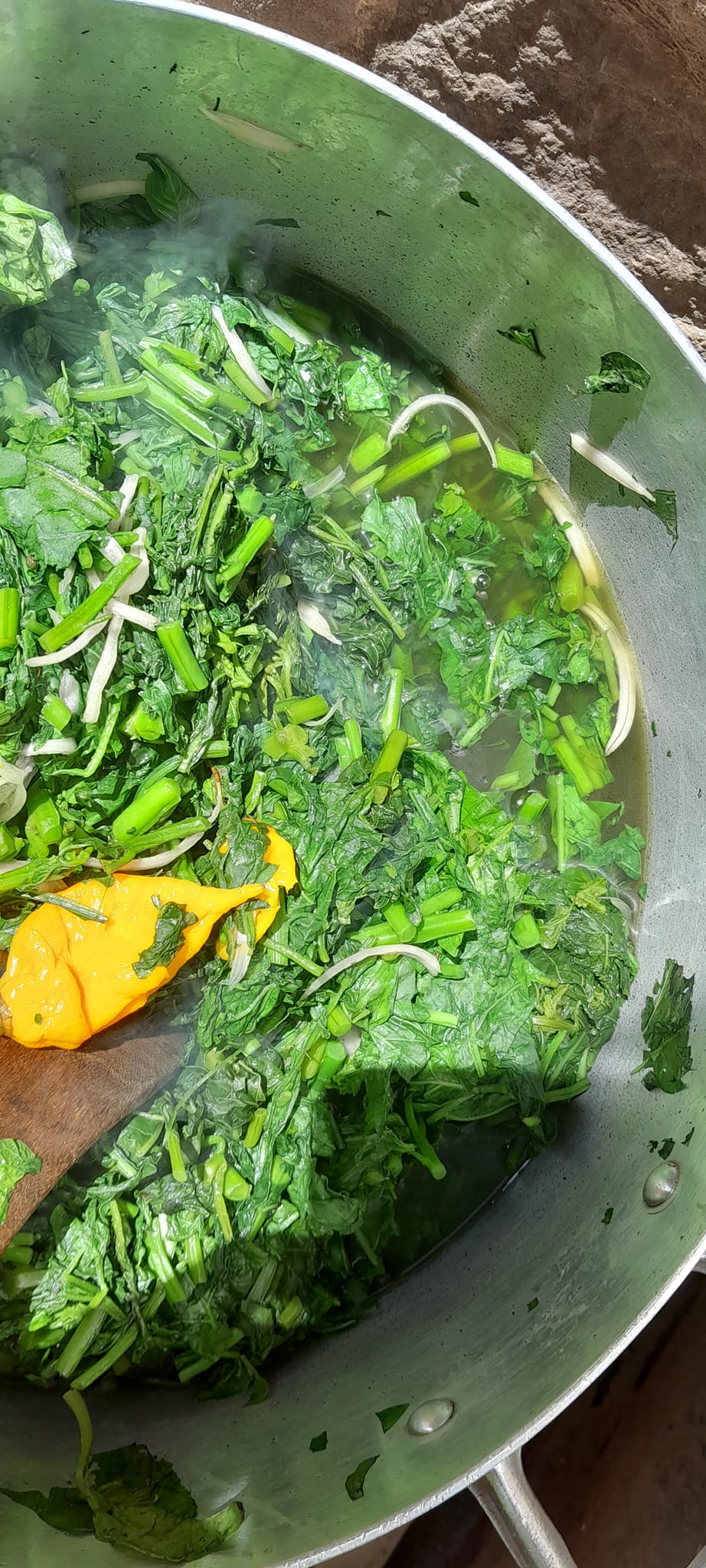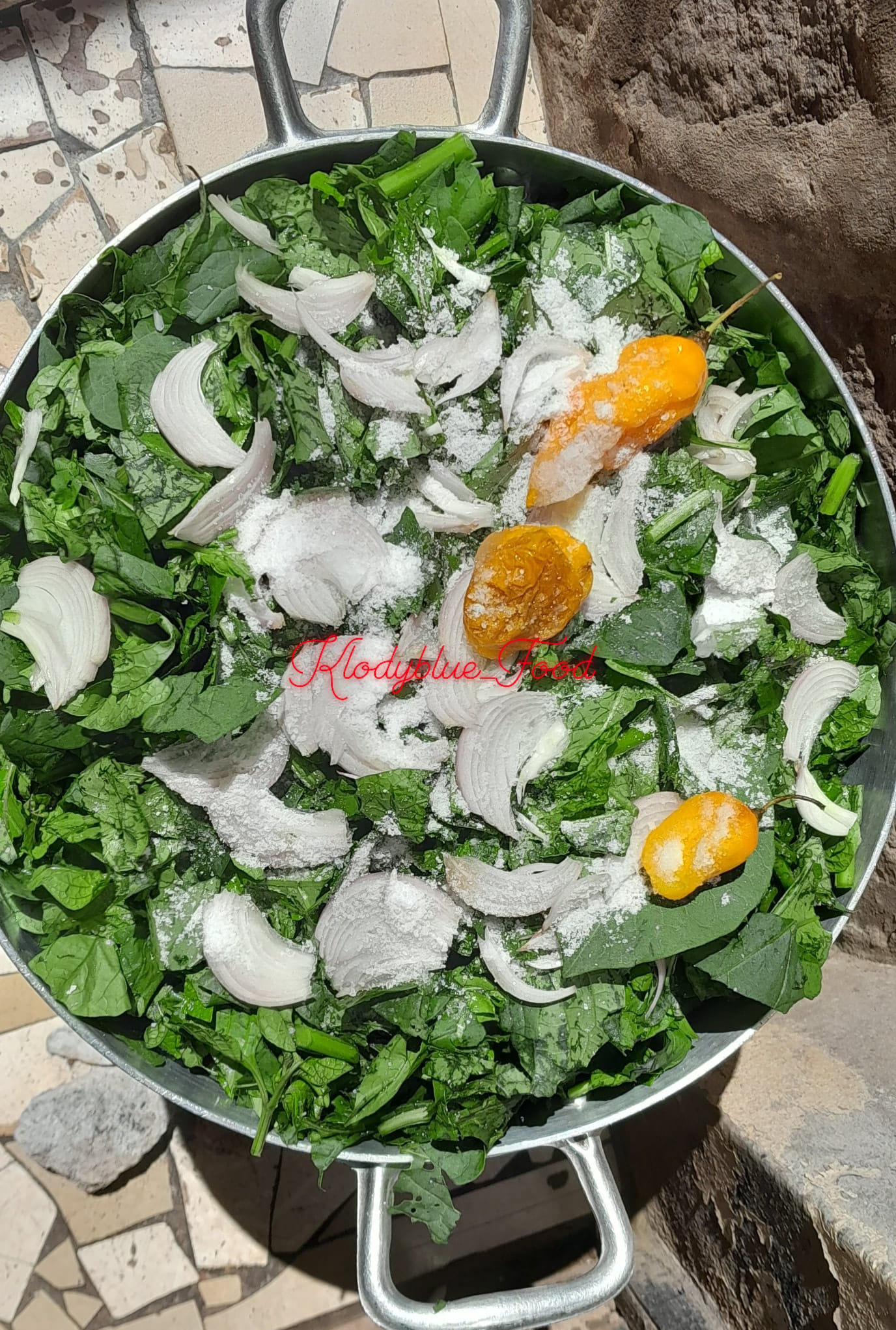 - Poser votre marmite au feu ajouter vos légumes laver puis des oignons sel et piments sans eaux (les légumes contiennent en majorité de l’eau donc pas nécessaire d’en ajouter)
