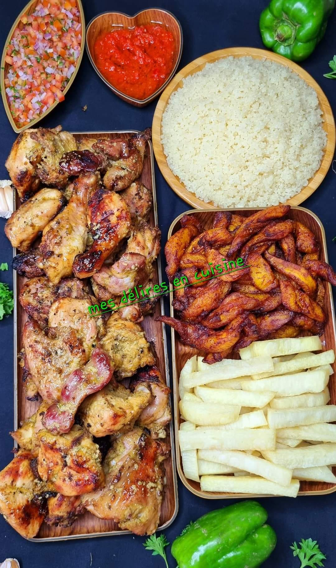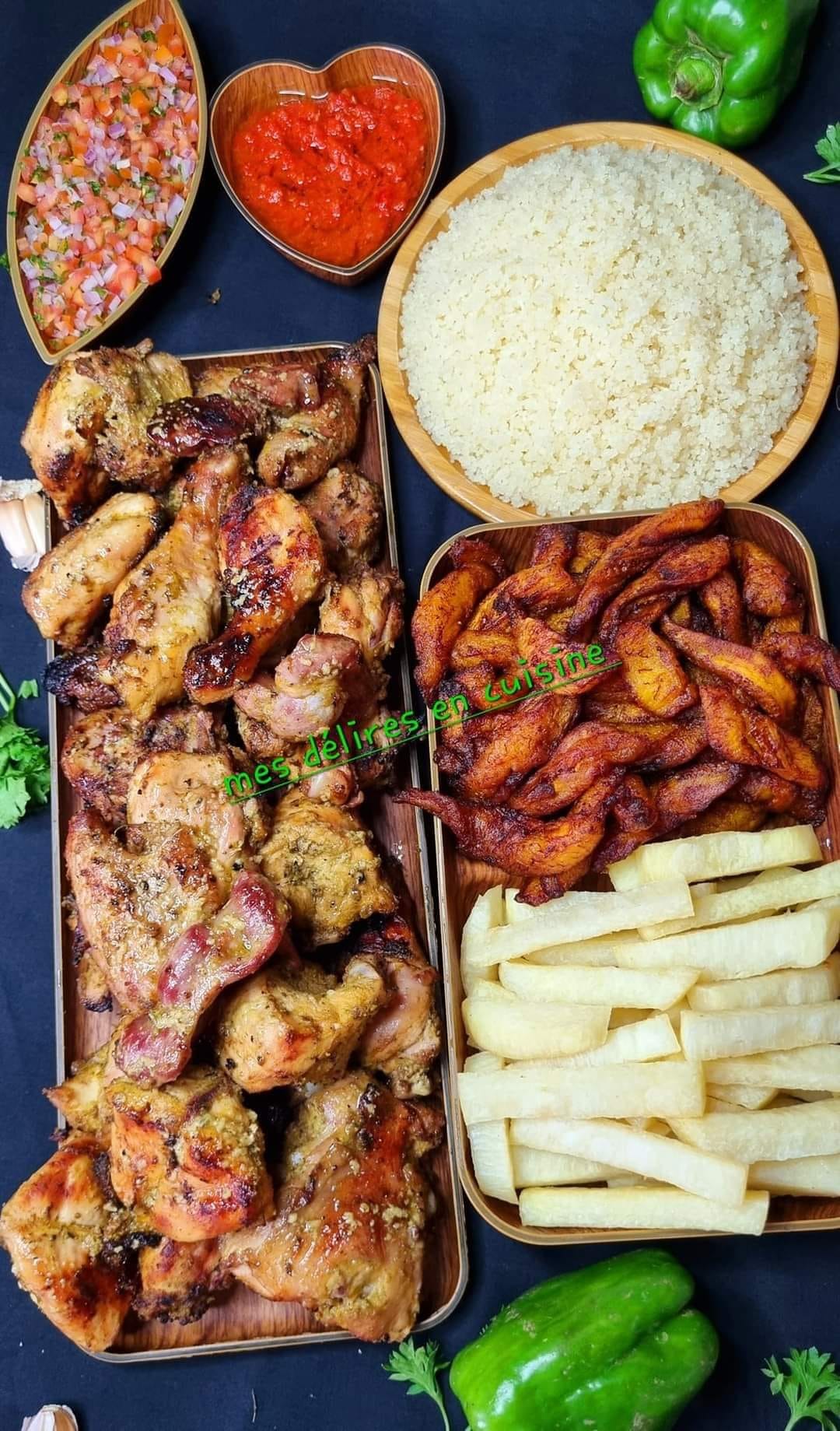 Fricassé de poulet grillé, accompagnement au choix(frites d’igname, alloco ou atiekè | Cuisine de Chez Nous