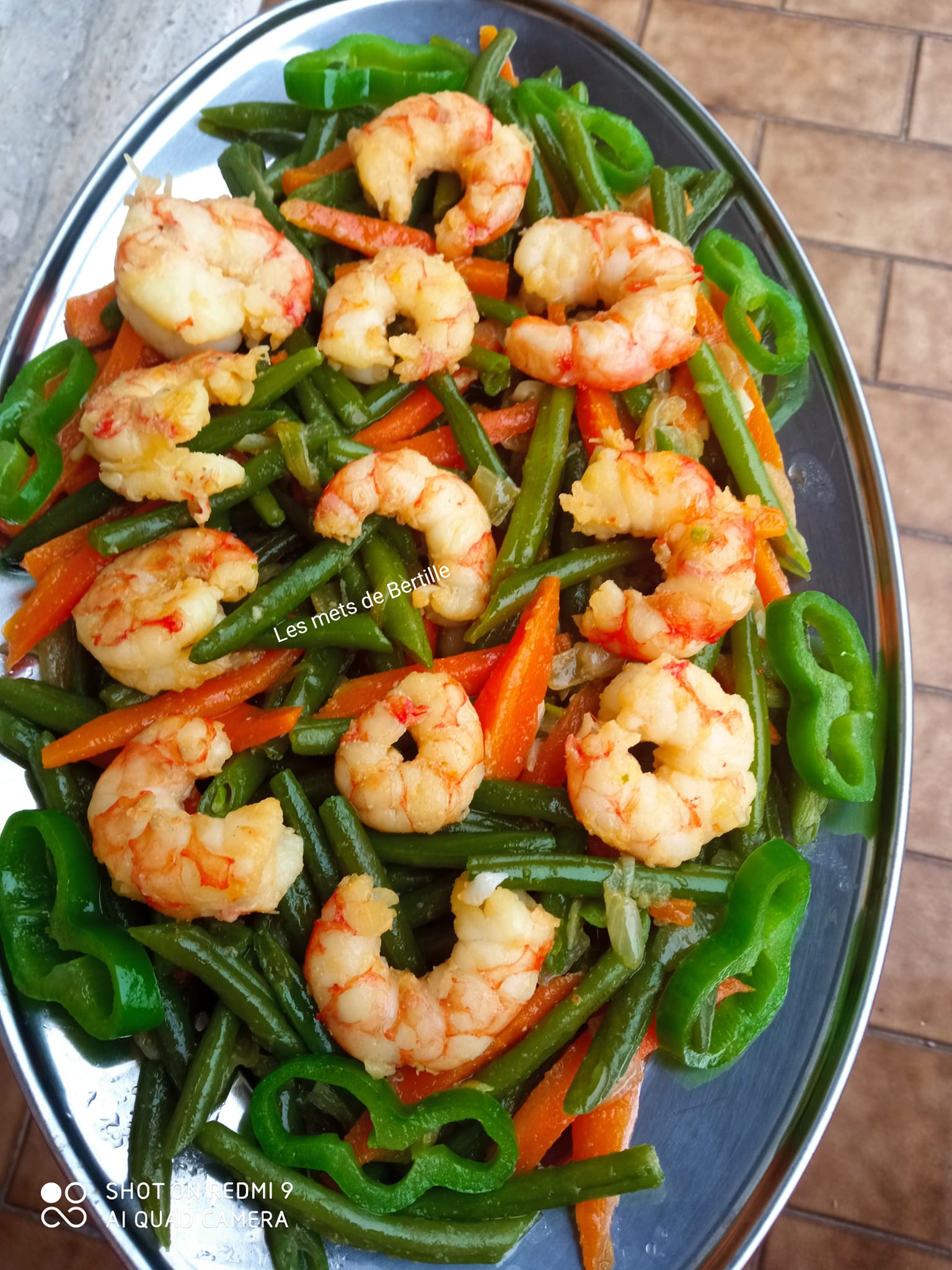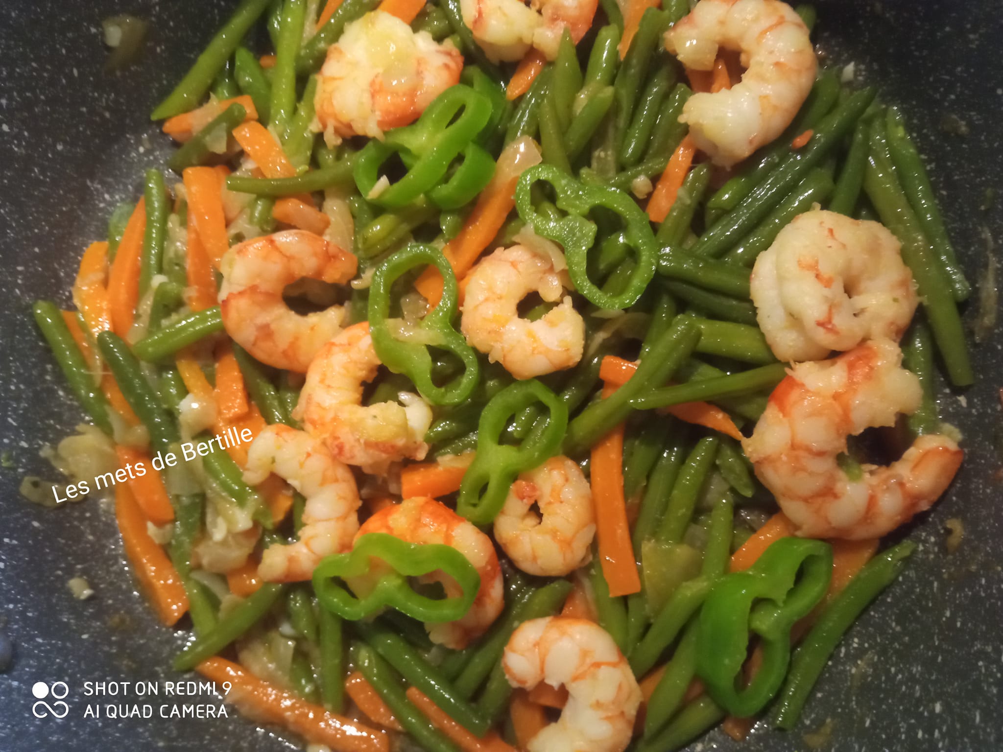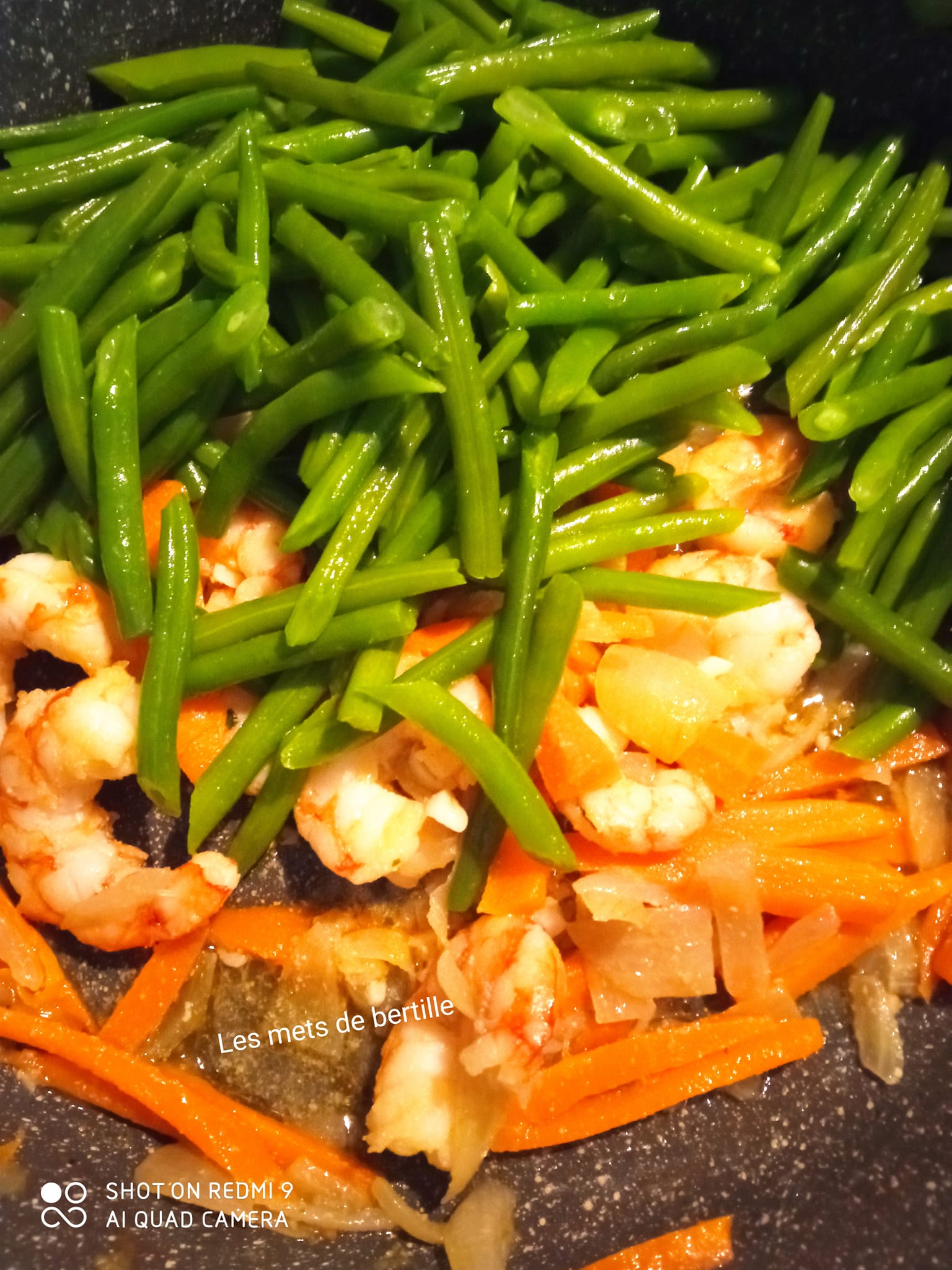 - Ajouter le haricot vert et les poivrons, laisser mijoter encore quelques minutes puis servir
