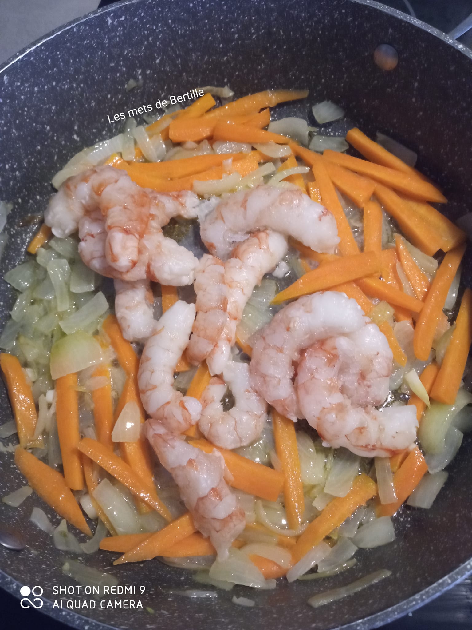 - Ajouter les crevettes, du sel, le bouillon et laisser mijoter pendant 5 minutes