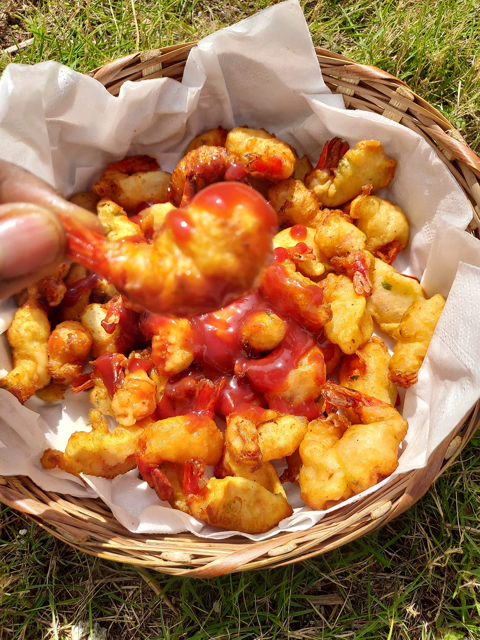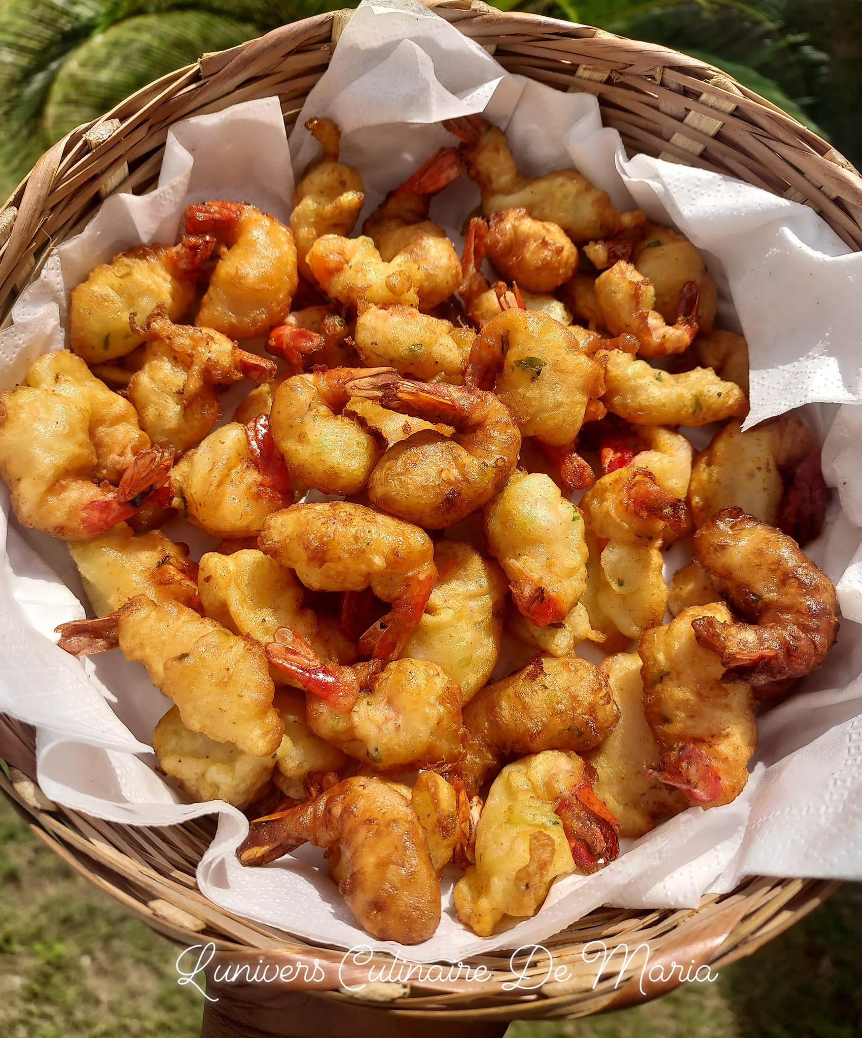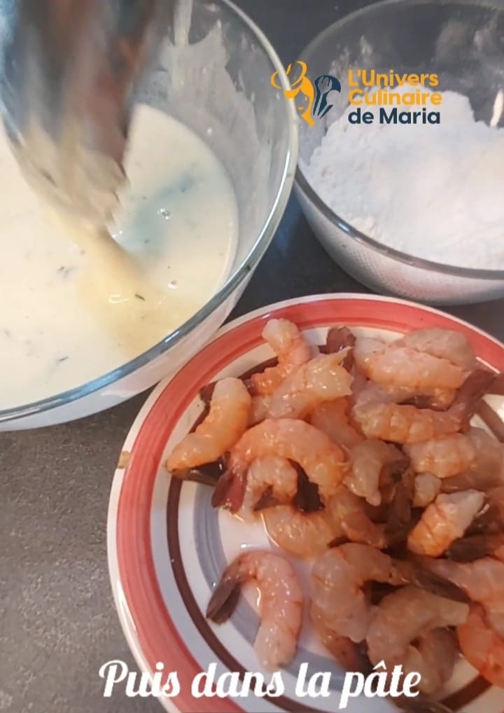Plongez chaque crevette dans la farine en attrapent par la queue puis dans la pâte ensuite plouf dans l’huile