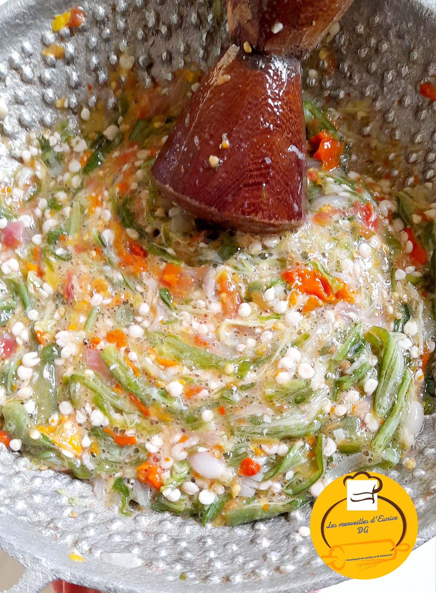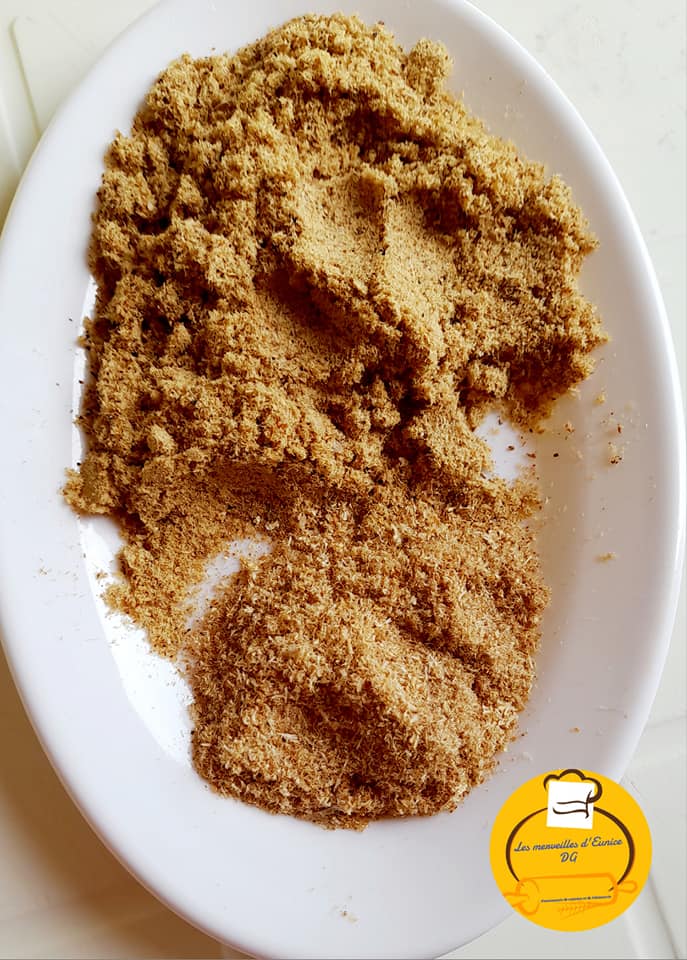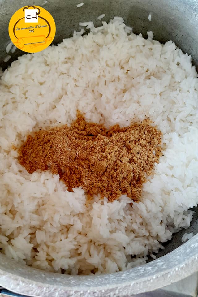 - Faites cuire votre riz , une fois l’eau du riz est finie, ajoutez la poudre de crevettes et mangne sec moulu, bien mélanger l’ensemble et poursuivez la cuisson à feu doux.
