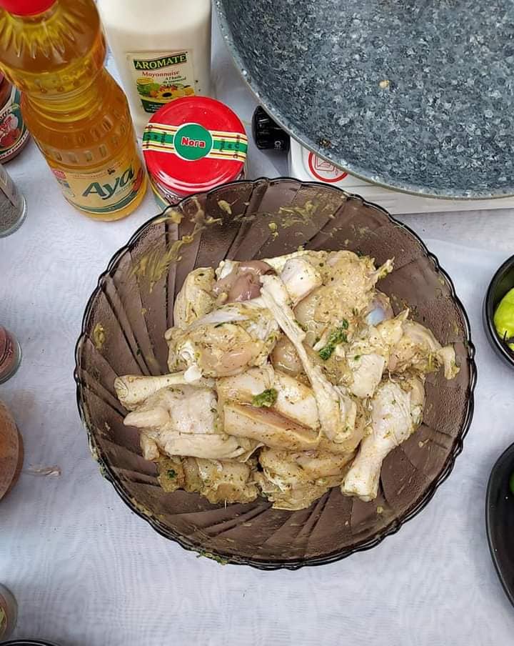 Ajouter un filet d’huile dans le poulet et laisser frire quelques minutes puit ajouter les légumes à la mayonnaise.