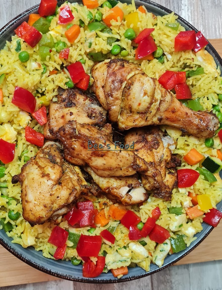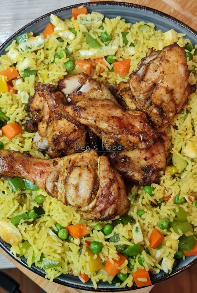 - Laver et faire cuire le riz avec les petits pois avec 250 ml d’eau, 2CàSd’huile, sel et la poudre de curry.