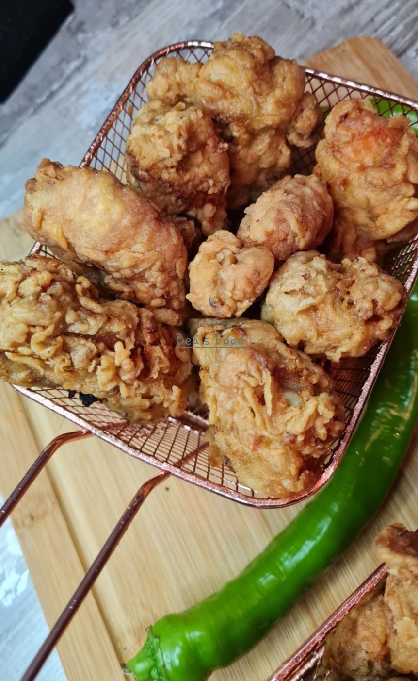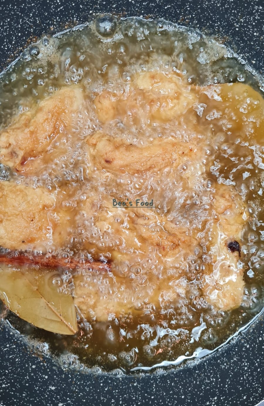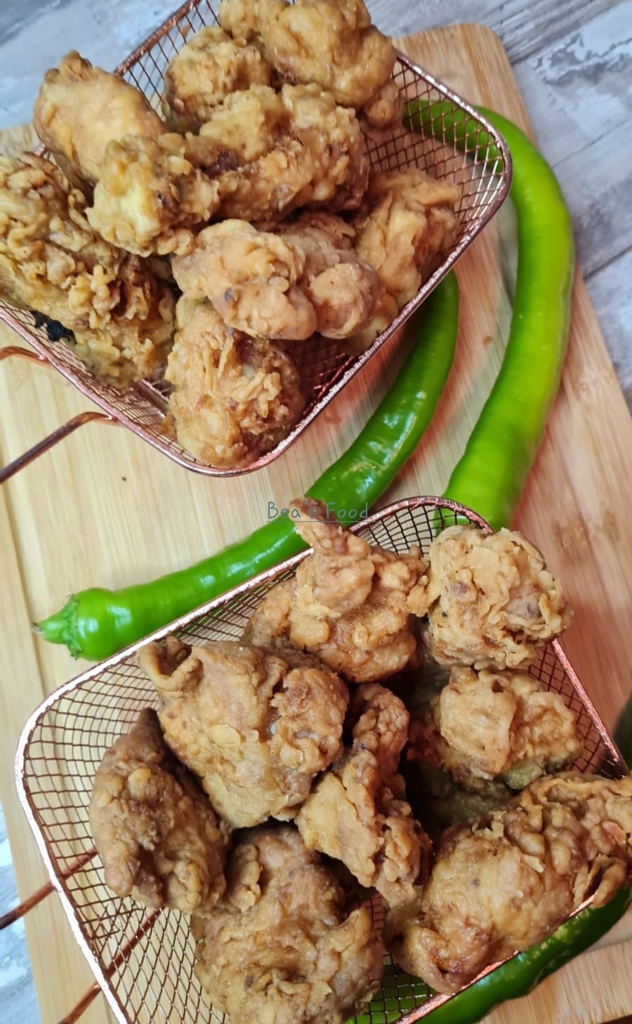 - Faire chauffer l’huile et secouer chaque morceau de poulet avec de frire.