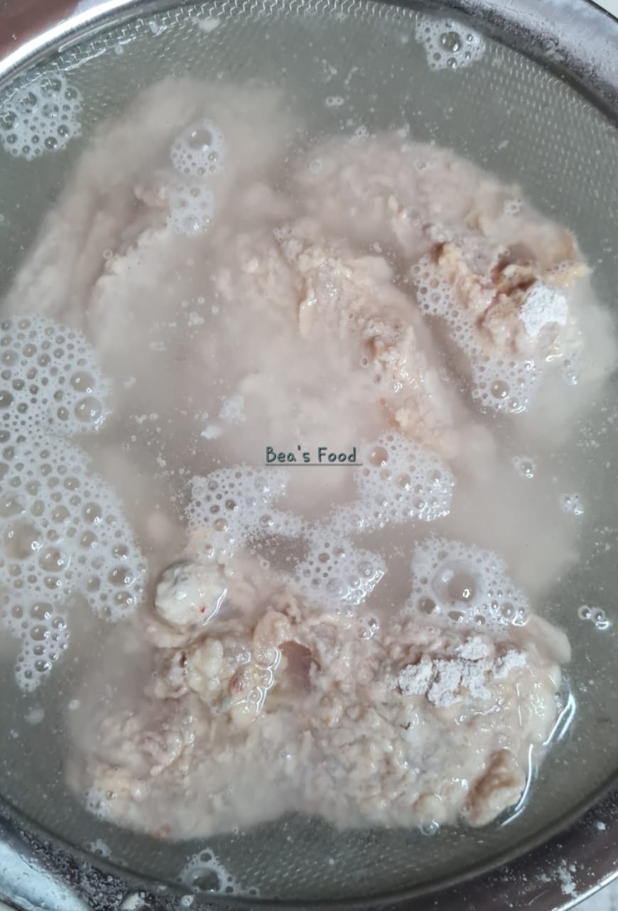 - Tremper les morceaux de poulet dans la farine, puis dans la passoire, les morceaux de poulet doivent être complètement tremper dans l’eau à travers la passoire.
