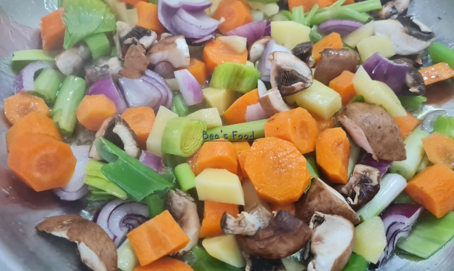 - Découpez les ingrédients de la première étape et les faire revenir dans l’huile avec 1càc de sel environ 15 min.