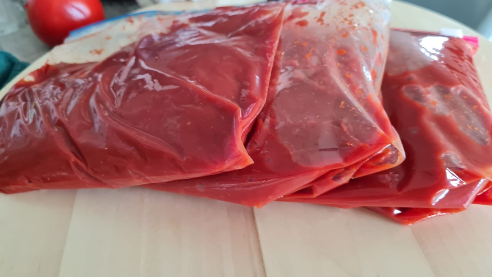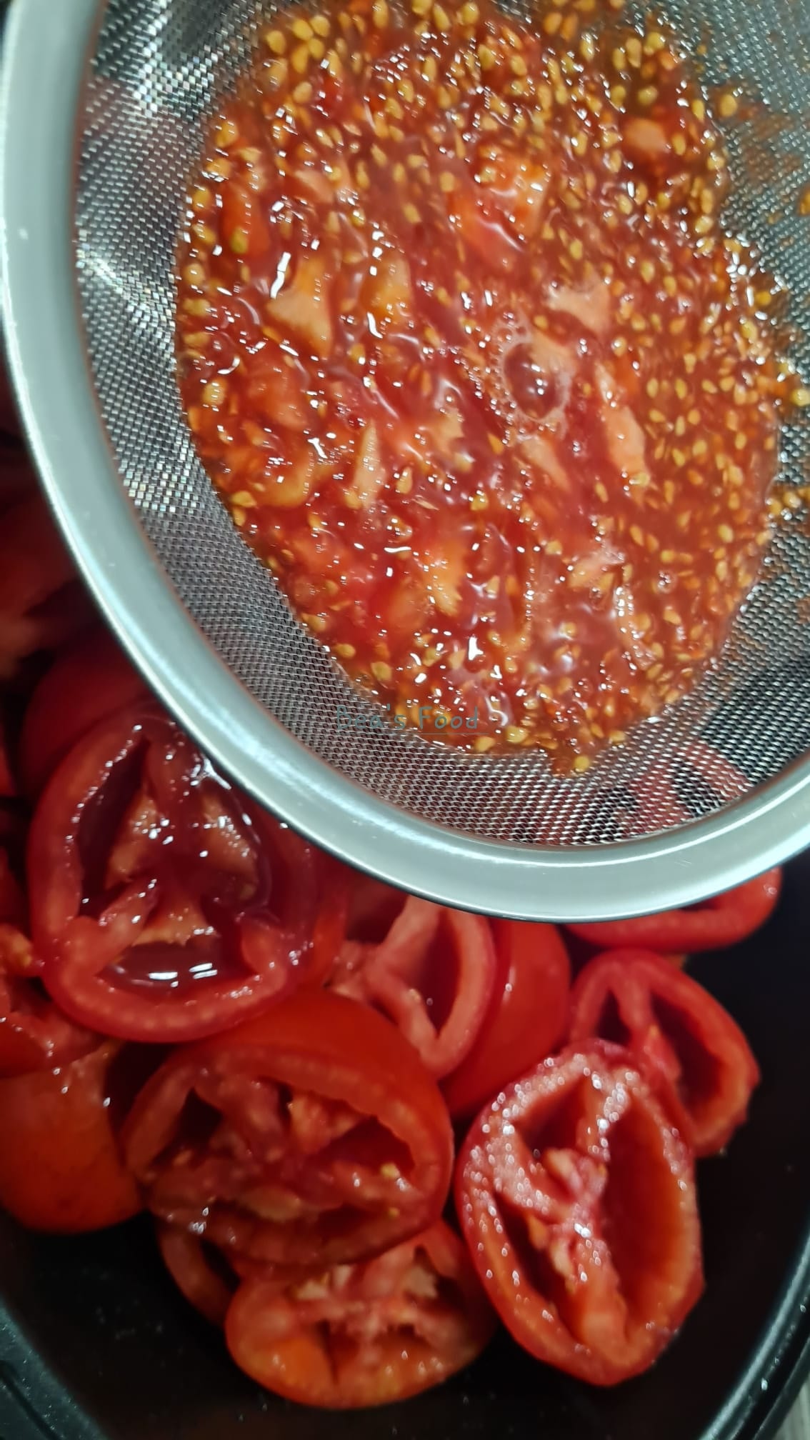 - Puis passer à la passoire les pépins afin de récupérer le jus de tomates.( vous pouvez planter les pépins)