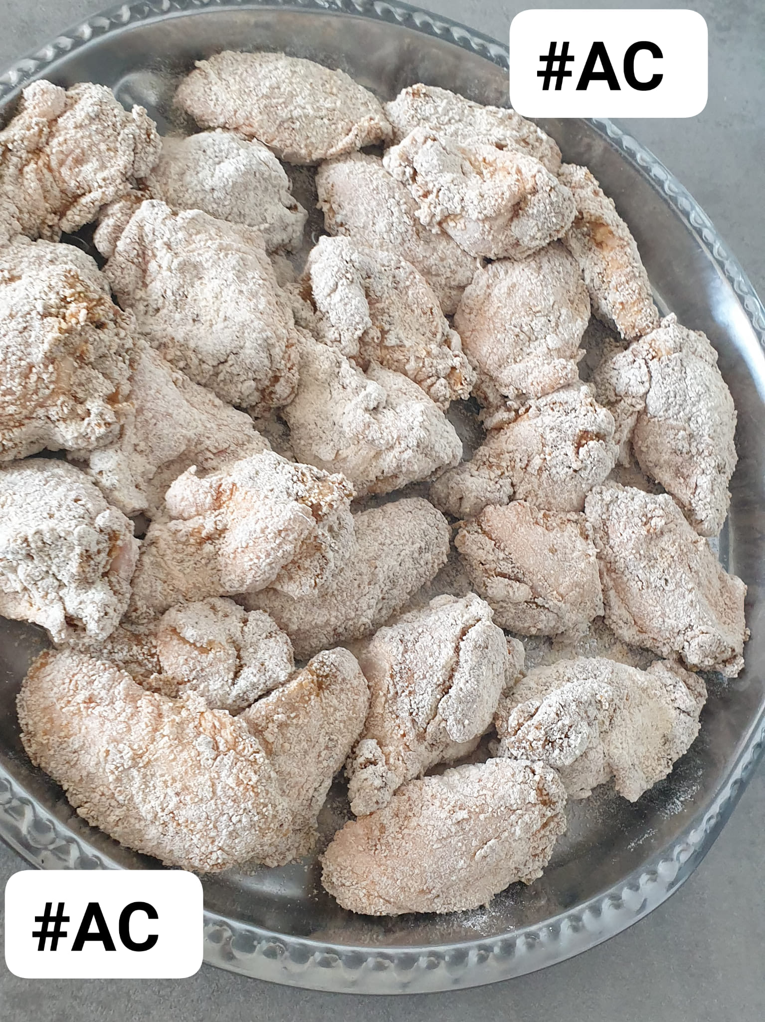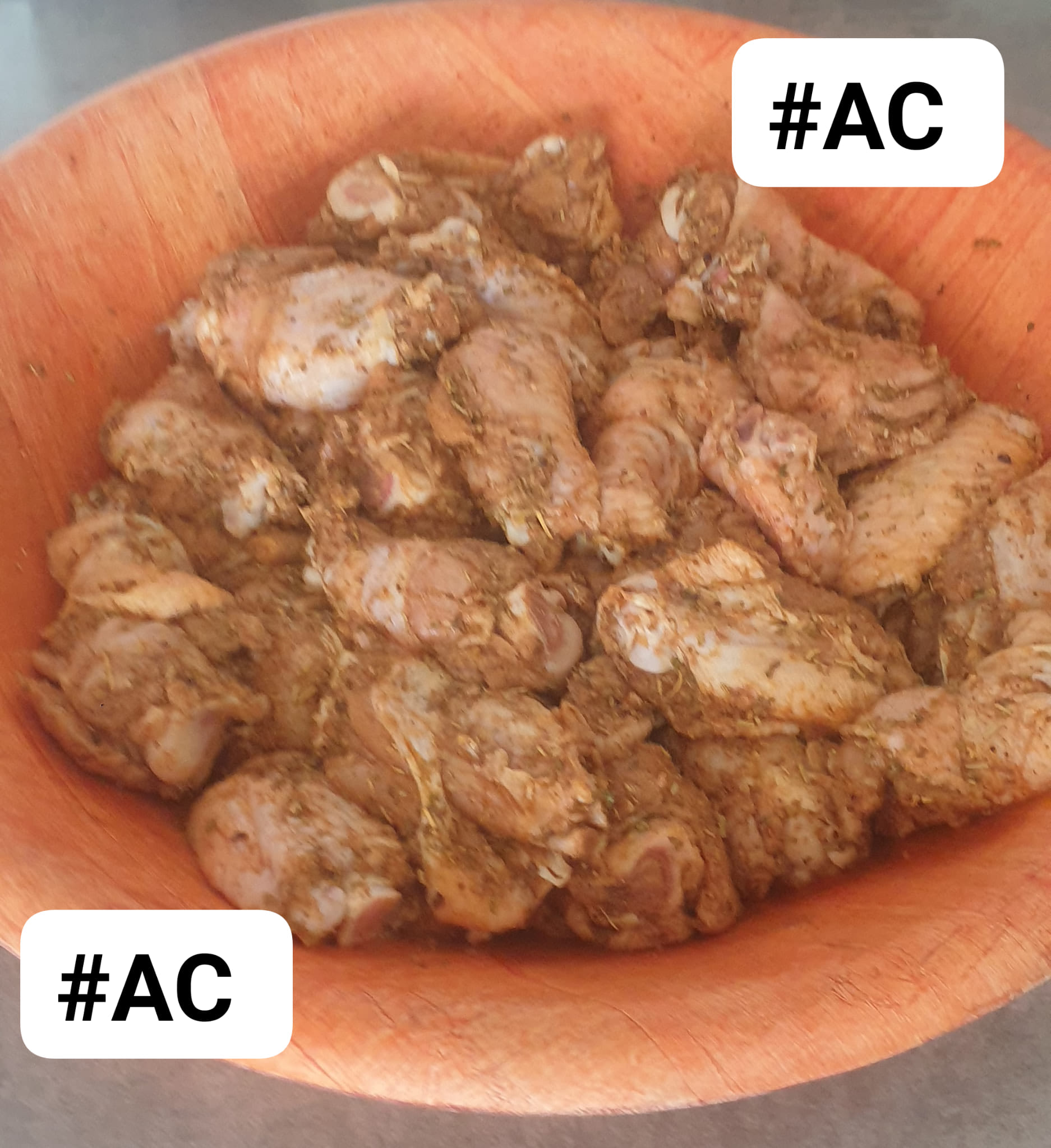 Couper les ailes de poulet en deux, bien nettoyer et bien taponner pour enlever l’eau . Mariner avec du sel, poivre noir et blanc, gingembre moulu, muscade, paprika, piment de cayenne ou piment en poudre, origan , herbes de Provence et romarin..