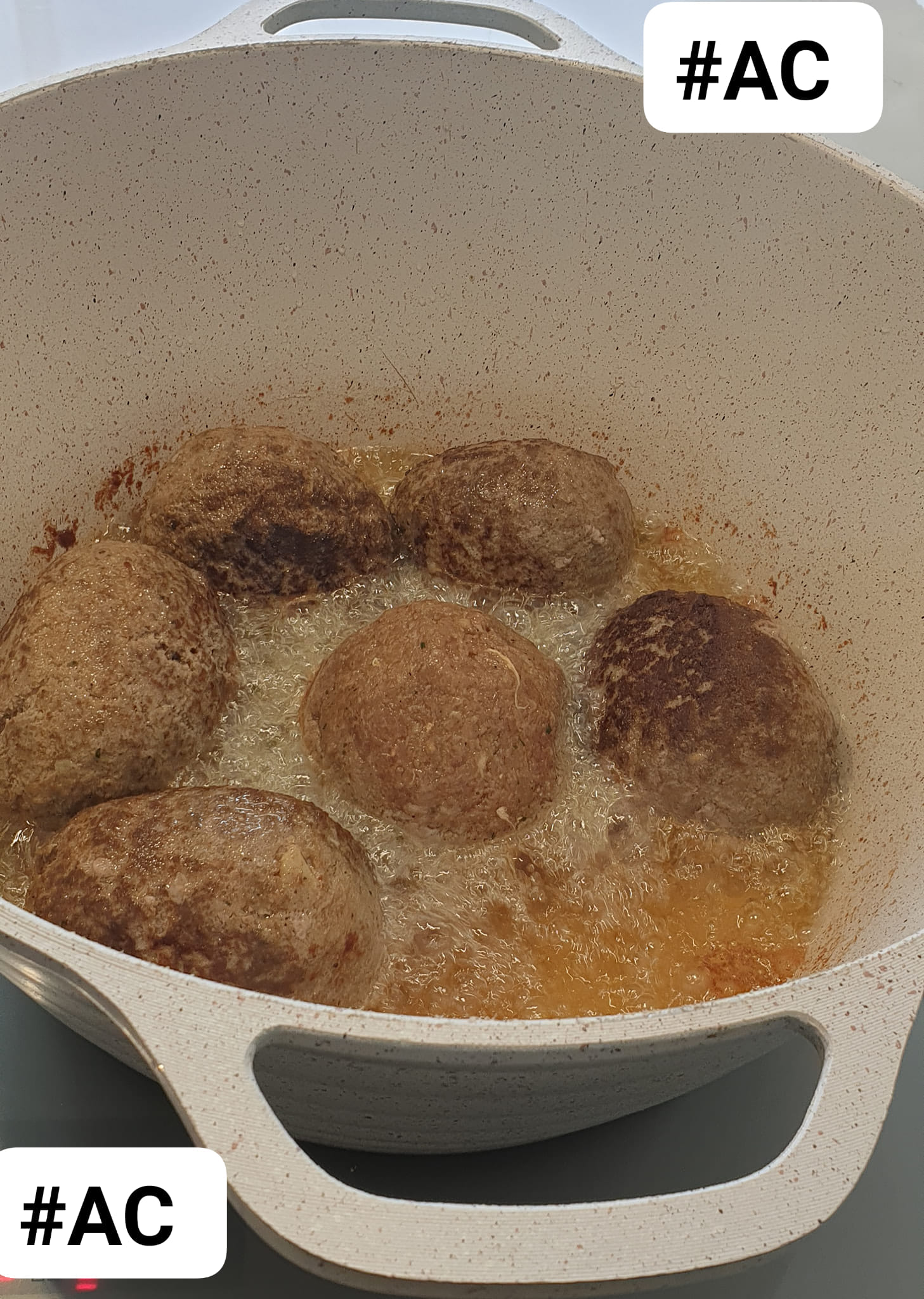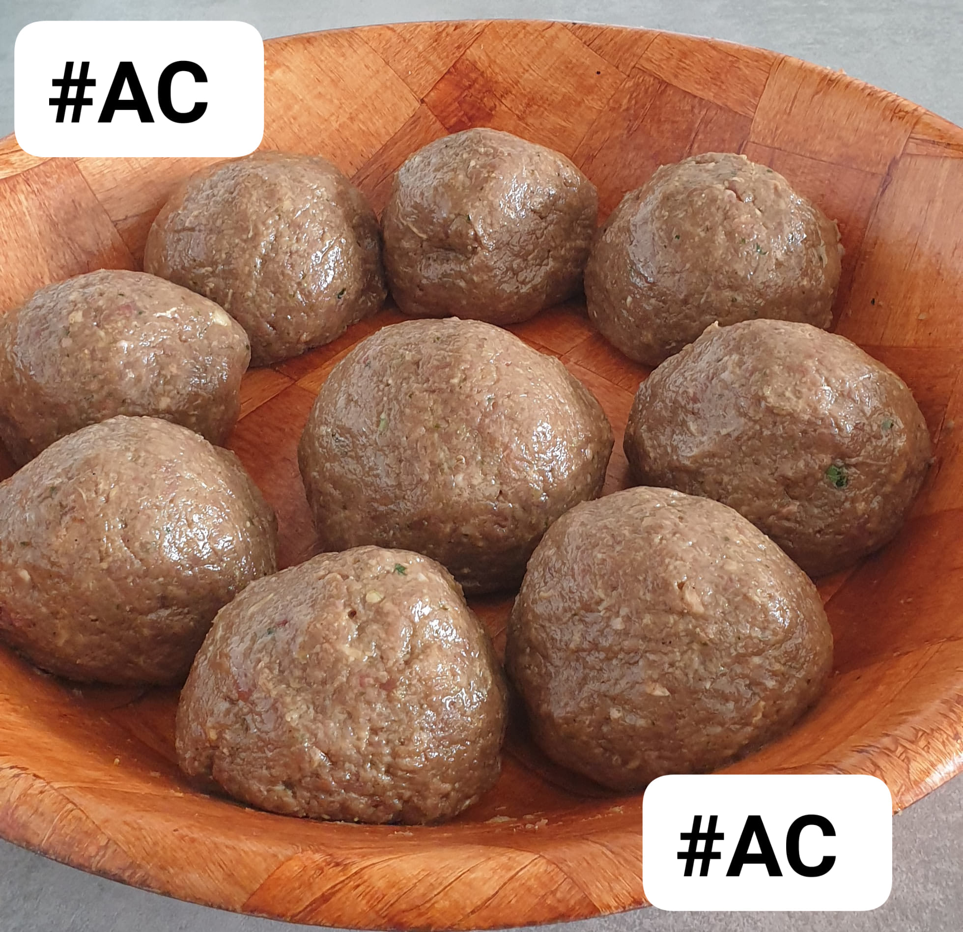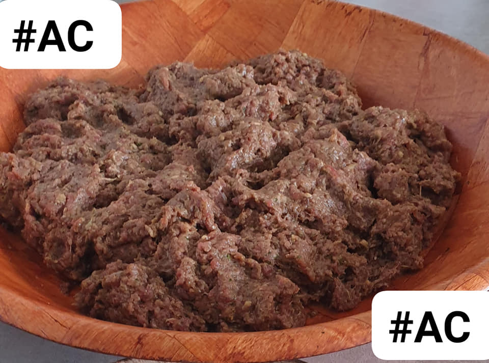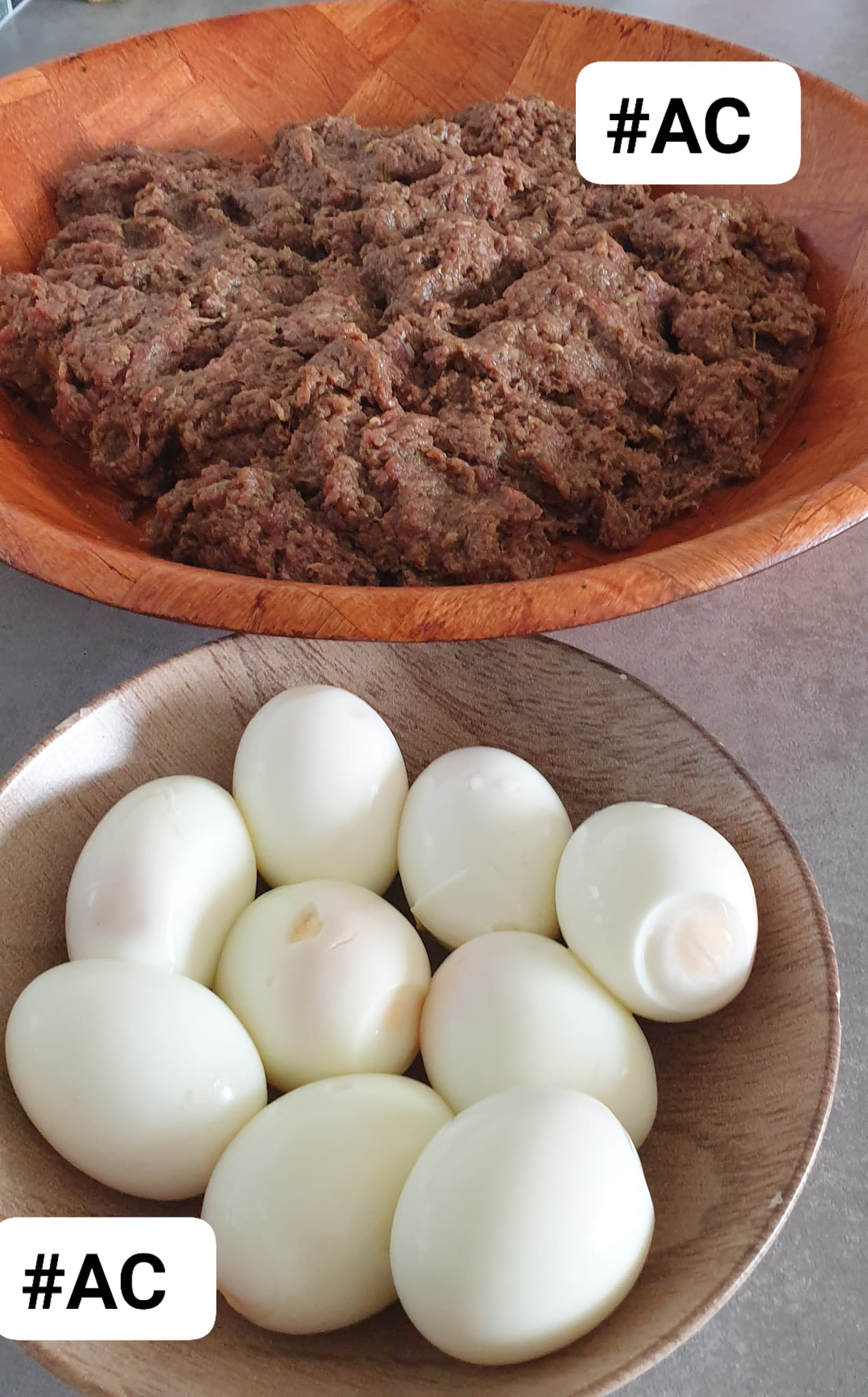 Ici : viande hachée (bœuf) avec oignon, persil, ail , poivre noir et blanc, gingembre, paprika sel cube(facultatif) après ajouter un œuf entier ou plus selon la quantité, un peu d’huile et, bien mélanger.