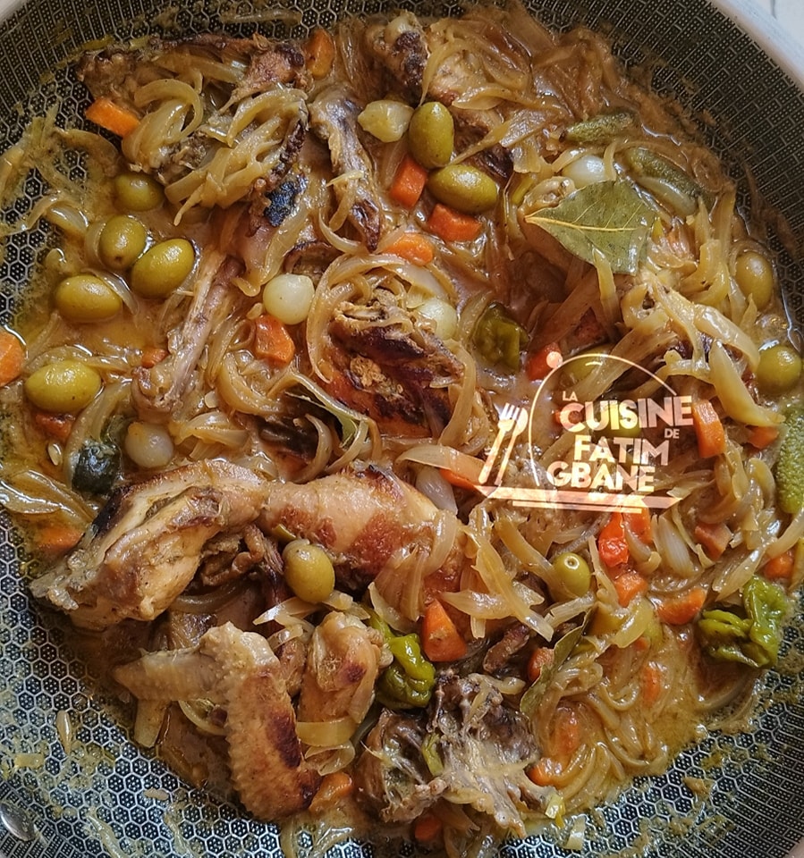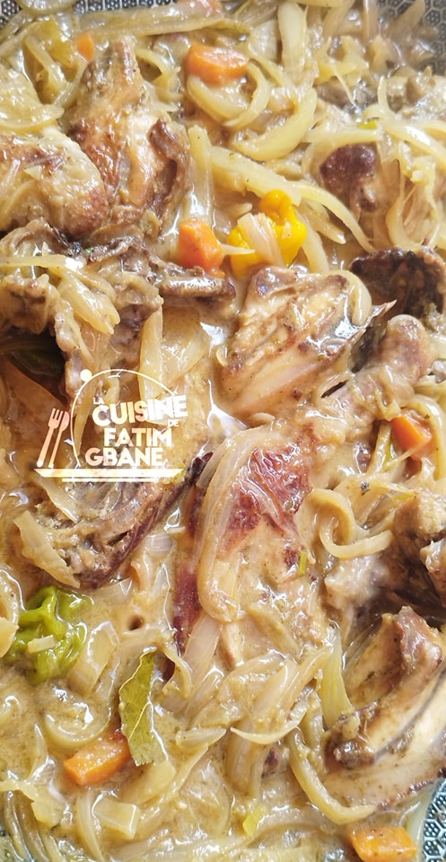 - Faire revenir les lamelles d’oignons dans de l’huile jusqu’à ce qu’ils soient translucides, on rajoute une cuillère à soupe de la marinade du poulet, de la moutarde, du vinaigre et du sel, bien surveiller pour éviter que ça ne crame.