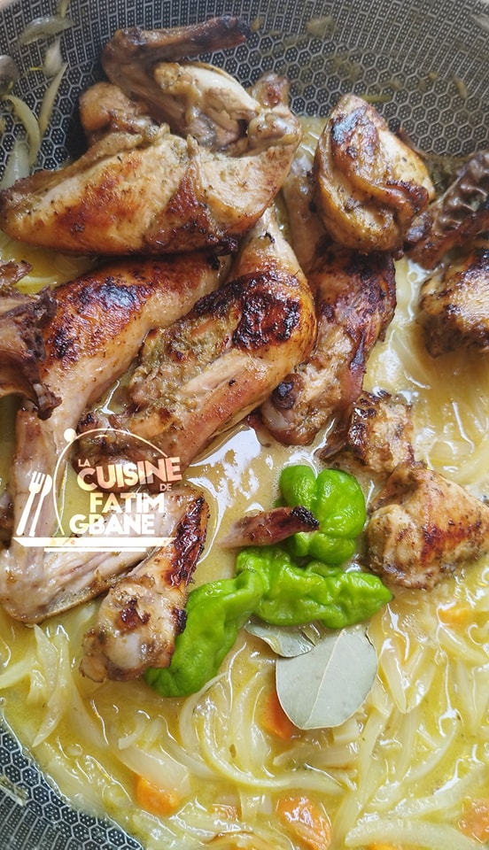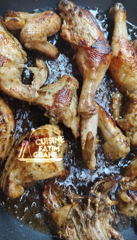- 5 min plus tard, on rajoute un peu d’eau, les morceaux de poulet, du piment, les feuilles de laurier puis porter à ébullition