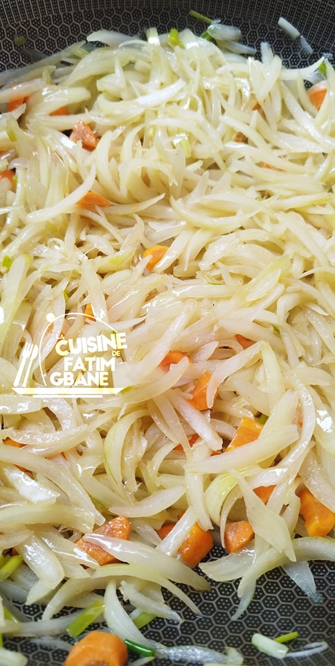 - Découper oignons en lamelle avec des dés de carottes et des tiges de feuilles d’oignons ( ciboulette) et les réserver.