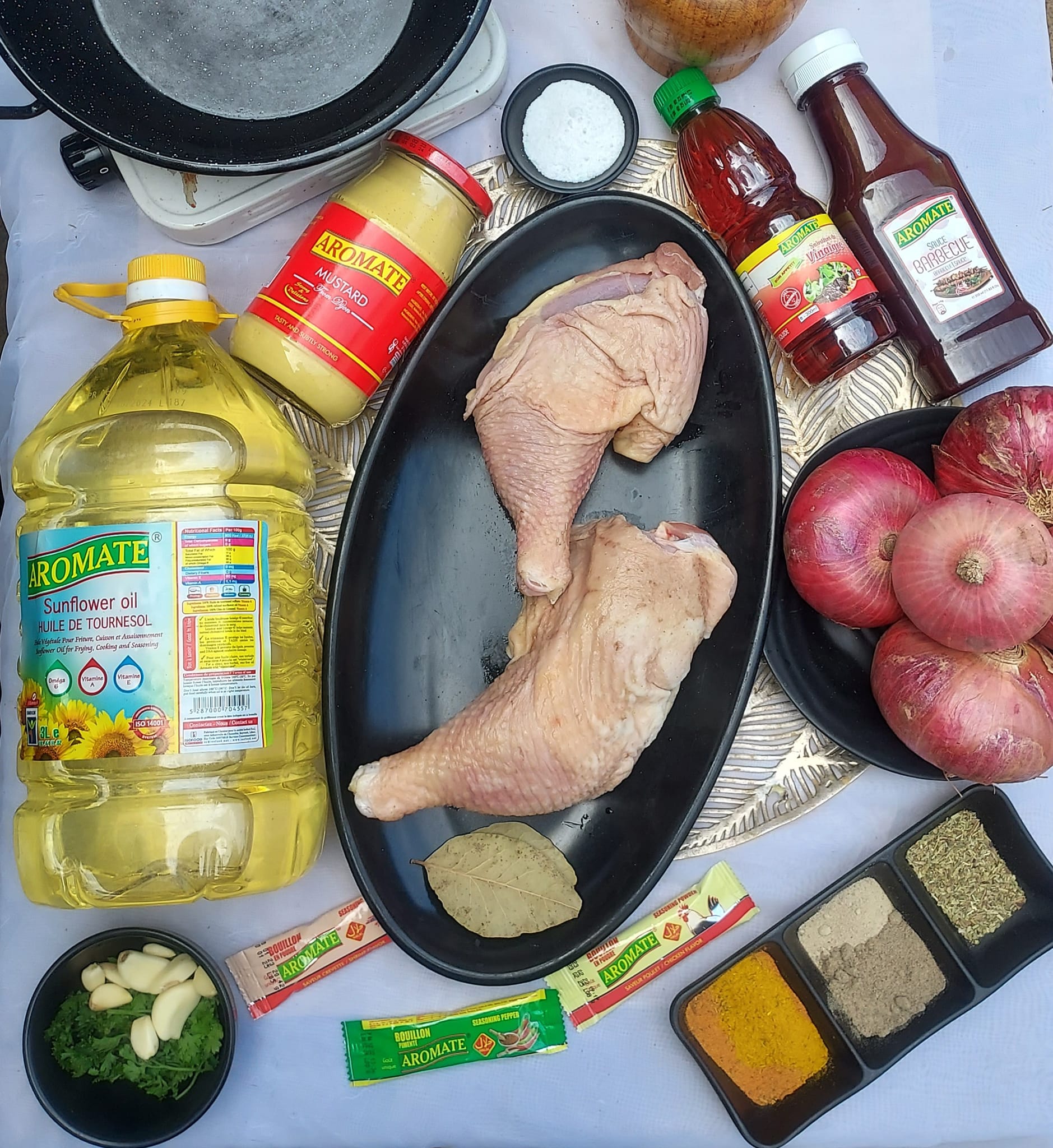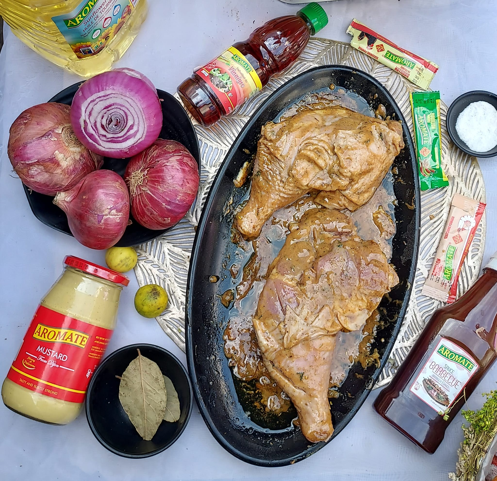 Mariner le poulet (ails persil sel, moutarde, sauce barbecue, vinaigre, poivre, herbe) et laisser mariner pendant 1h de temps