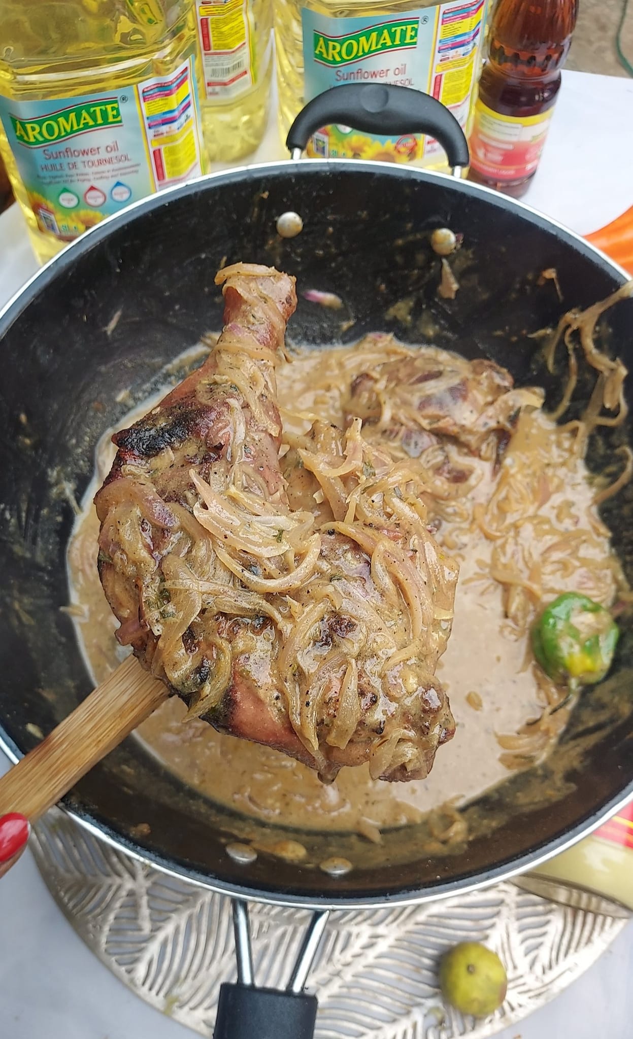 Assaisonner, ajouter les morceaux de poulet précuits, ajouter un peu d’eau et laissez mijoter à feu doux pendant une quinzaine de minutes environ