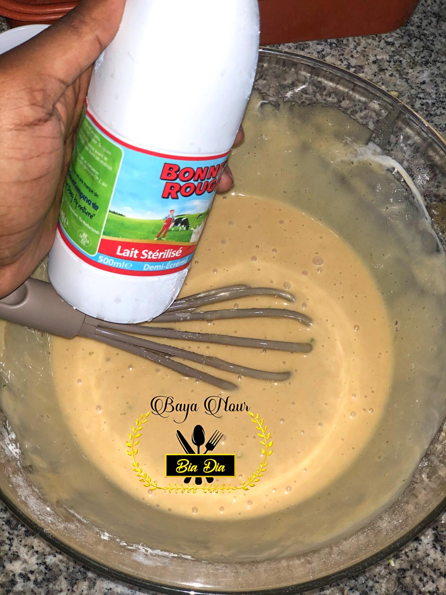 - Enfin incorporez les 500 ml de lait et mélangez bien le tout .