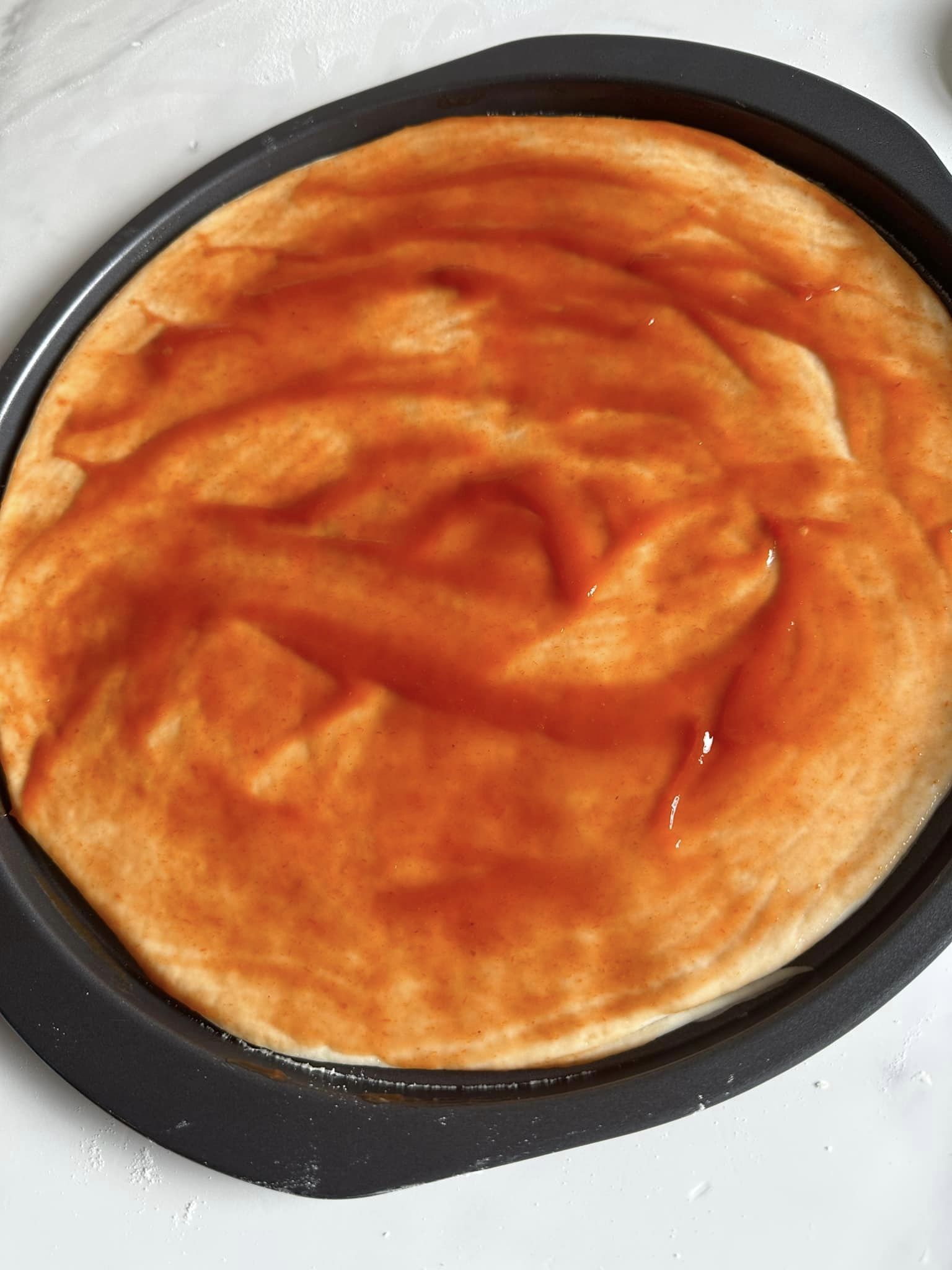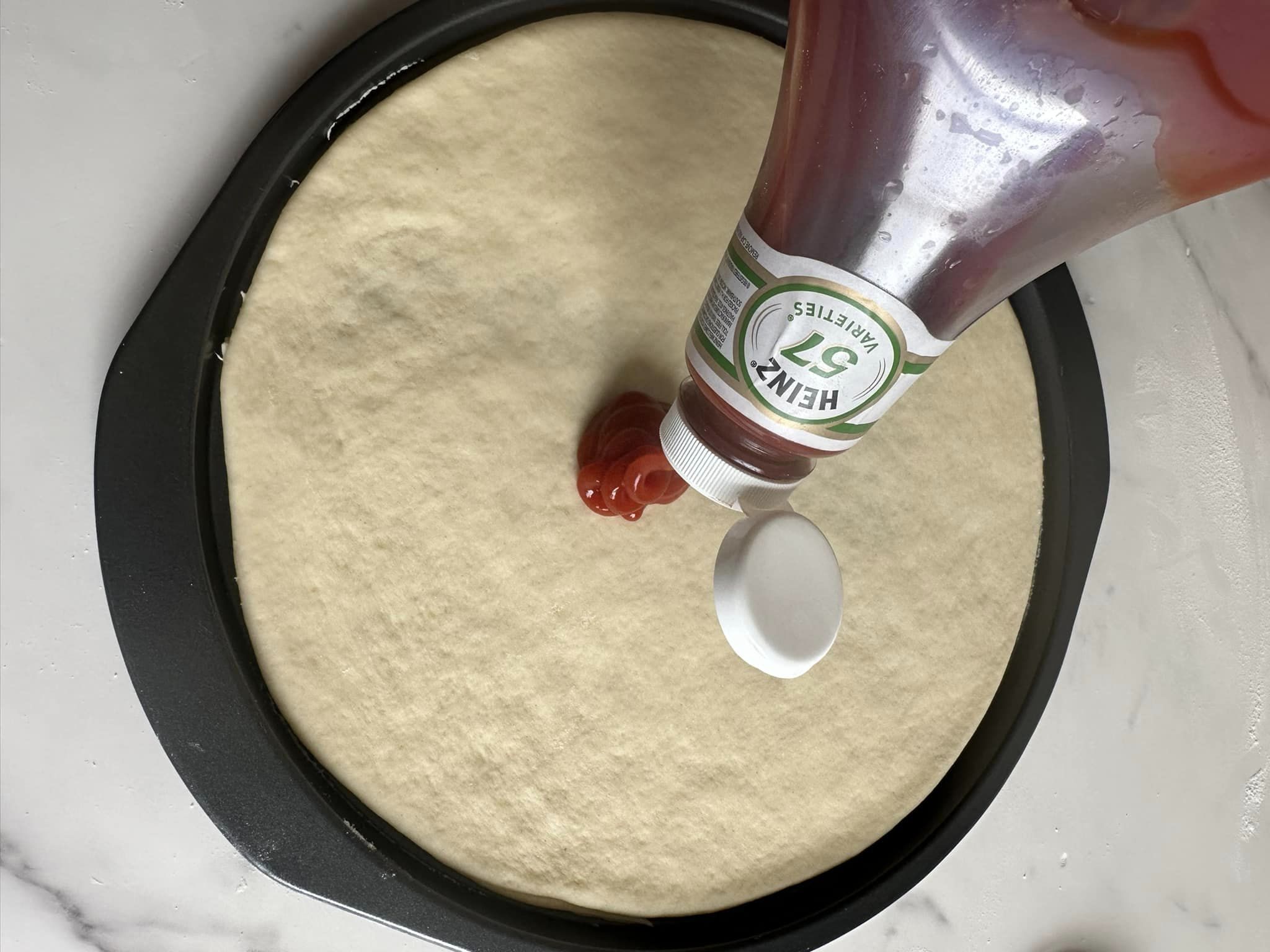 - Graissez le plateau, placez la pâte à pizza, étalez la sauce tomate ou le ketchup