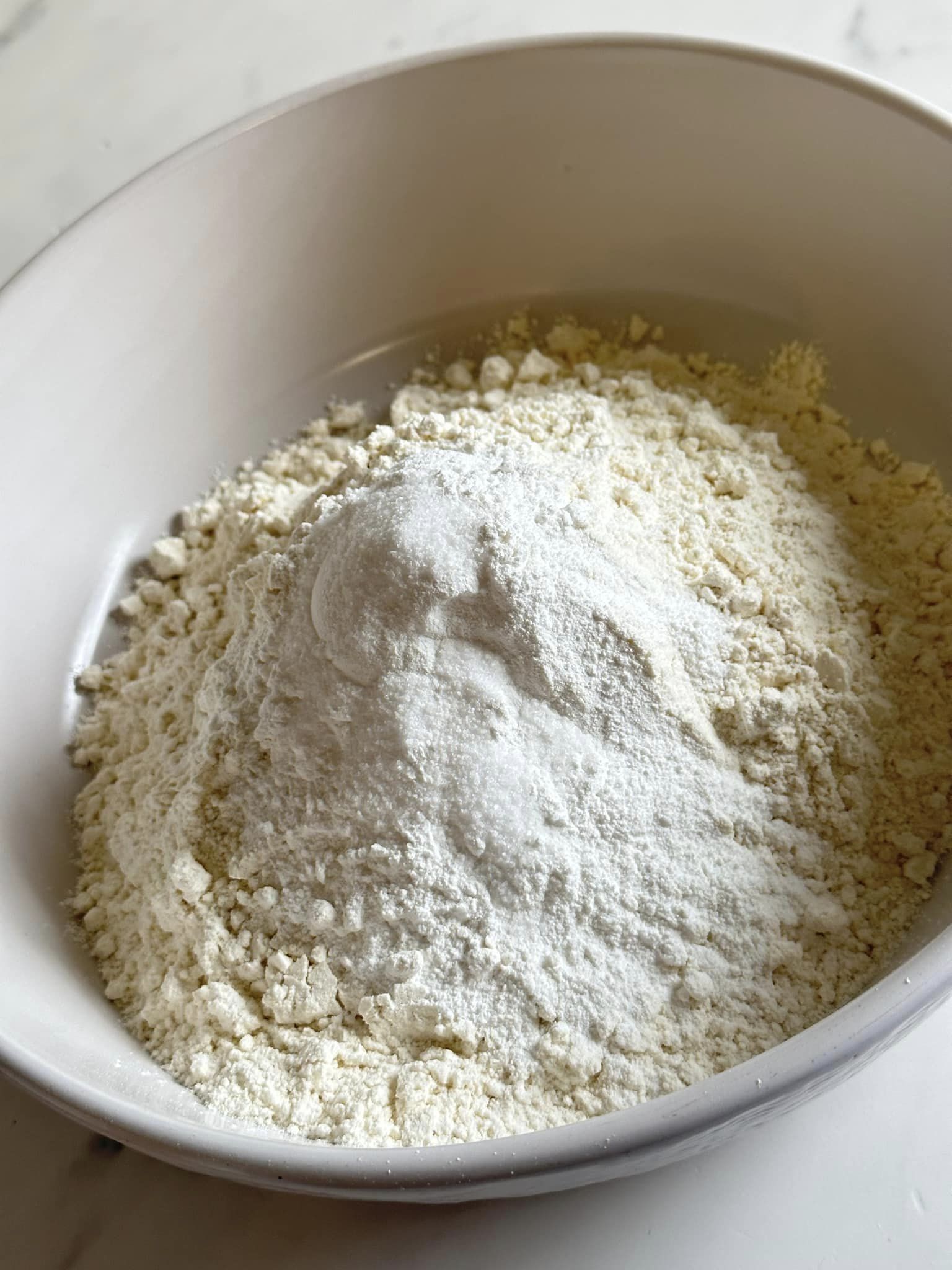 - Dans un grand bol, placer 3 tasses de farine ordinaire/tout usage, 3 cuillères à café de poudre à pâte et 1 cuillère à café de sel. Bien mélanger