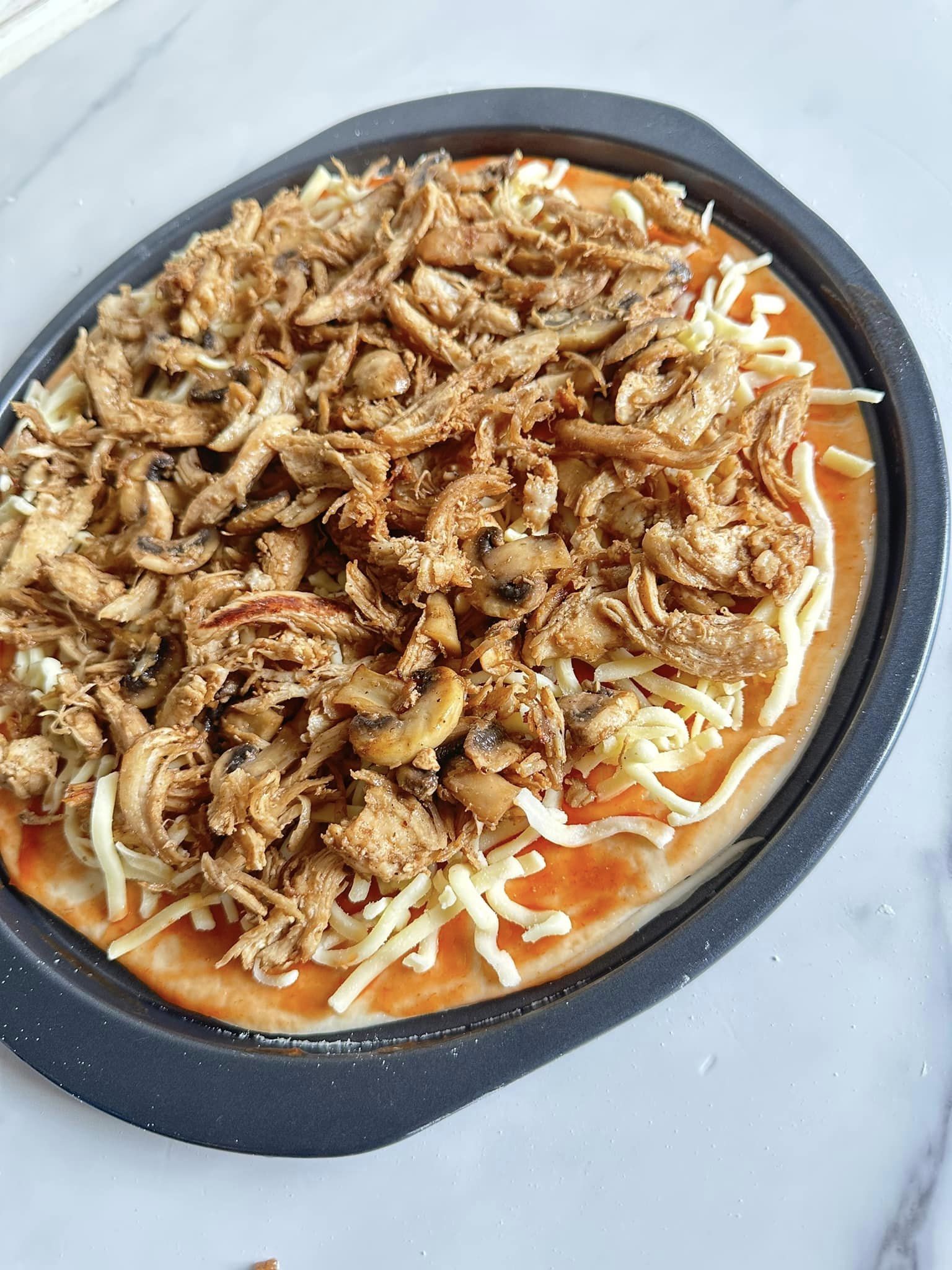 - Ajouter du fromage, puis ajouter des garnitures sur le fromage, ajouter plus de fromage sur les garnitures
