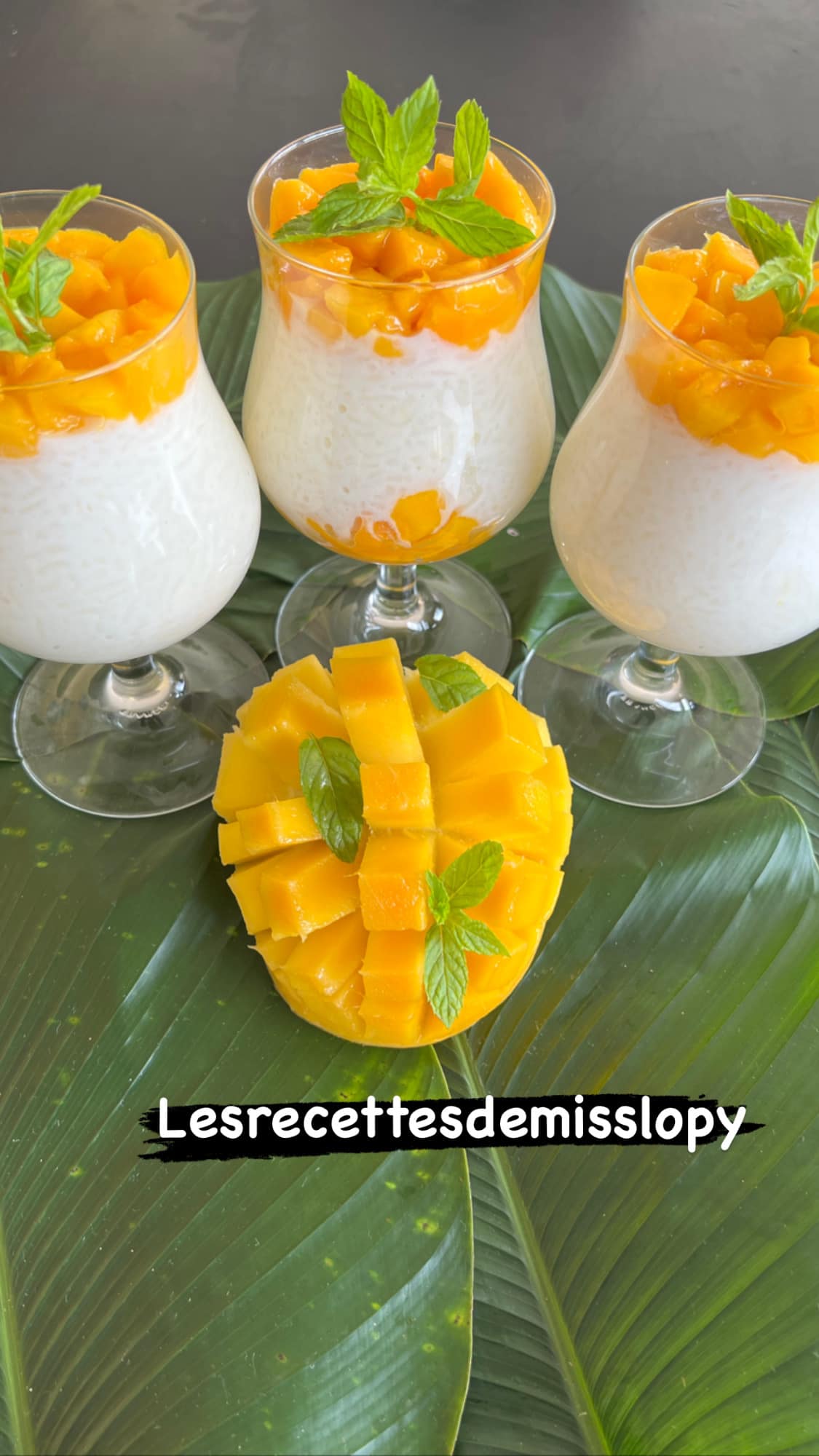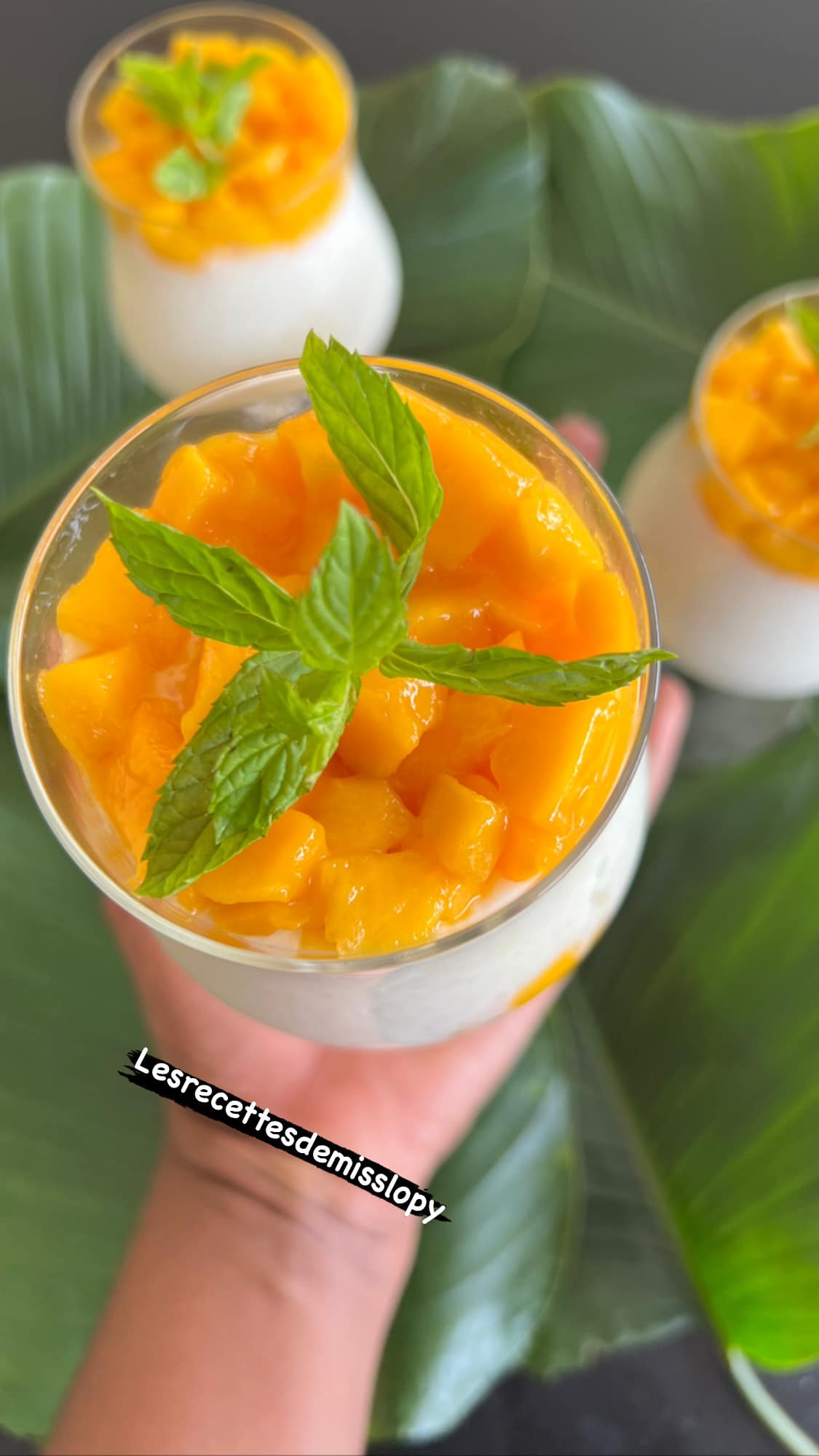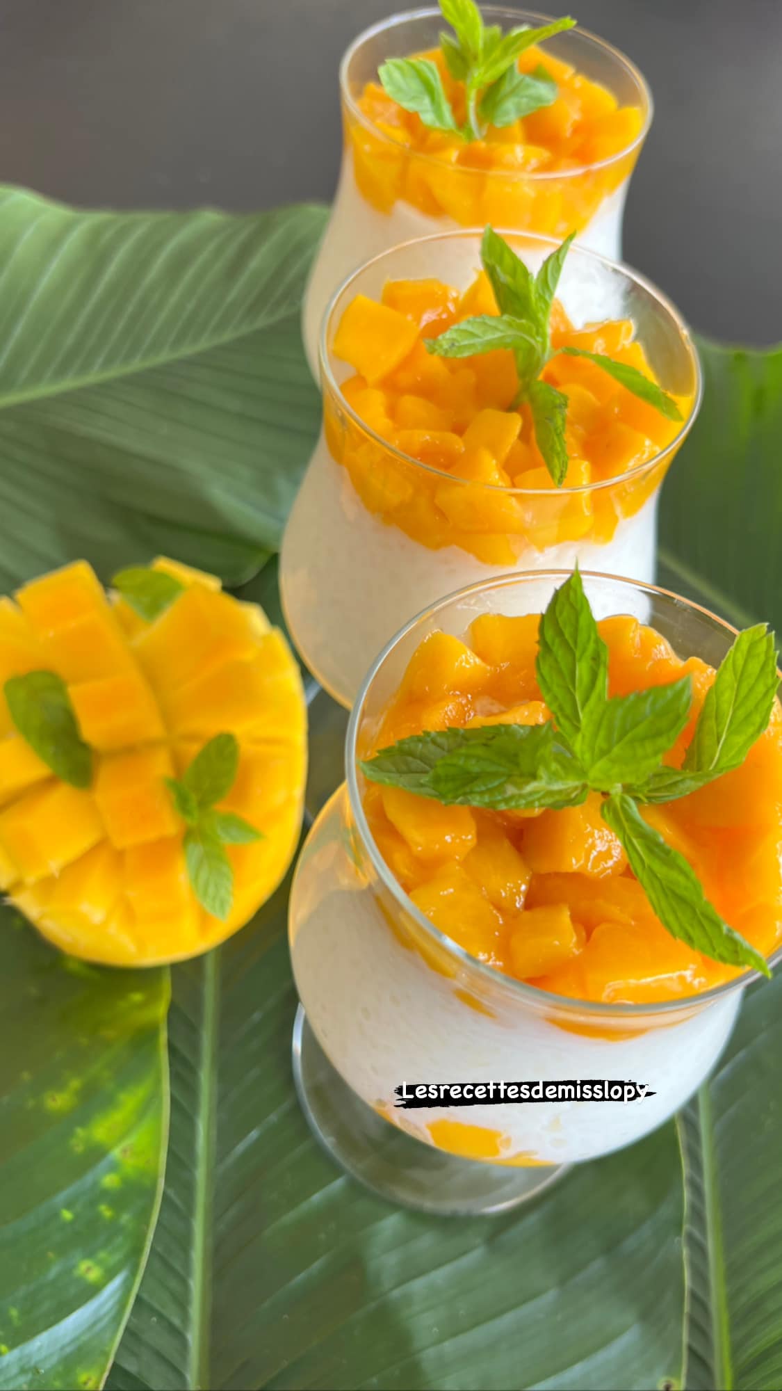 - Laissez refroidir un peu avant de servir dans des contenants de votre choix et déposez y au dessus et / ou au fond des dés de chaires de mangues.