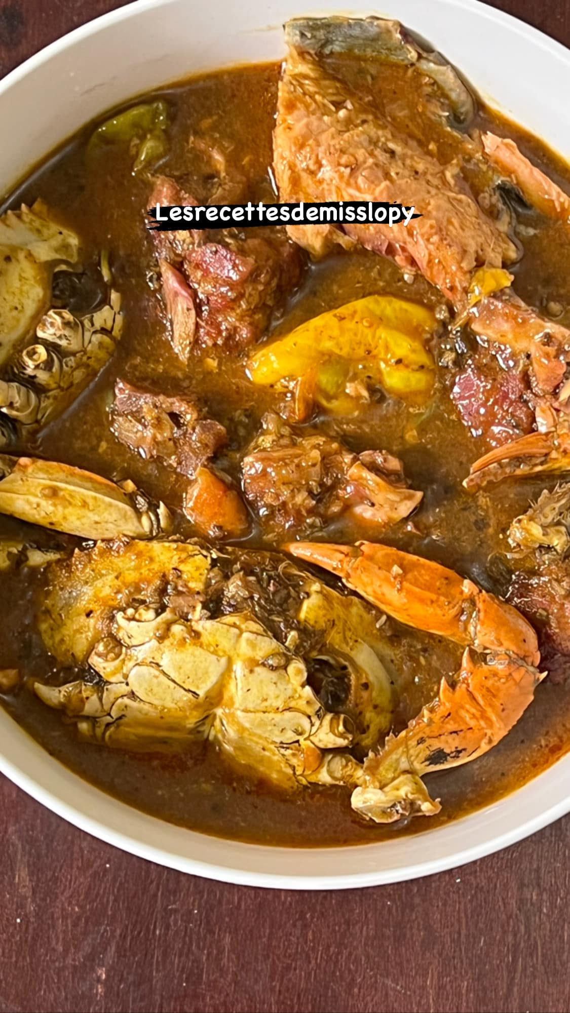 - Ajoutez le poisson faisandé ou adjovan et environ 2 litres d’eau et poursuivre la cuisson environ 15 minutes. Mettre l’huile rouge , le poisson fumé les crabes et les crevettes puis le nokoss composé d’un peu d’oignon de piments et des poudres de poisson et crevettes le tout pilé. Laissez mijoter environ 30 minutes à feu moyen doux.