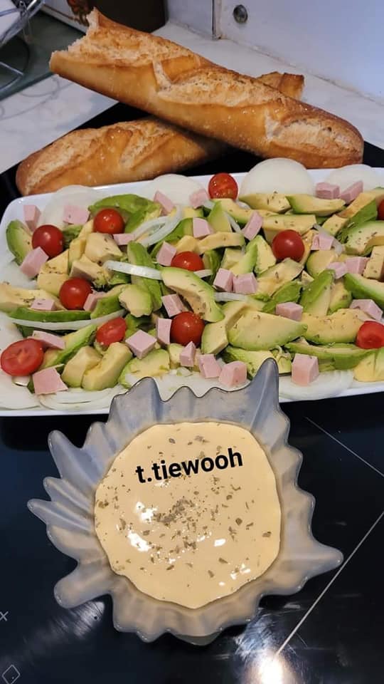 - 3 jaunes d’œuf, un peu de vinaigre, demi litre d’huile fine, fouetter les jaunes en ajoutant l’huile petit à petit, ajouter le poivre et sel, 1 grosse gousse d’ail râpé ou une cuillère à soupe d’ail moulu, une pointe de sucre.