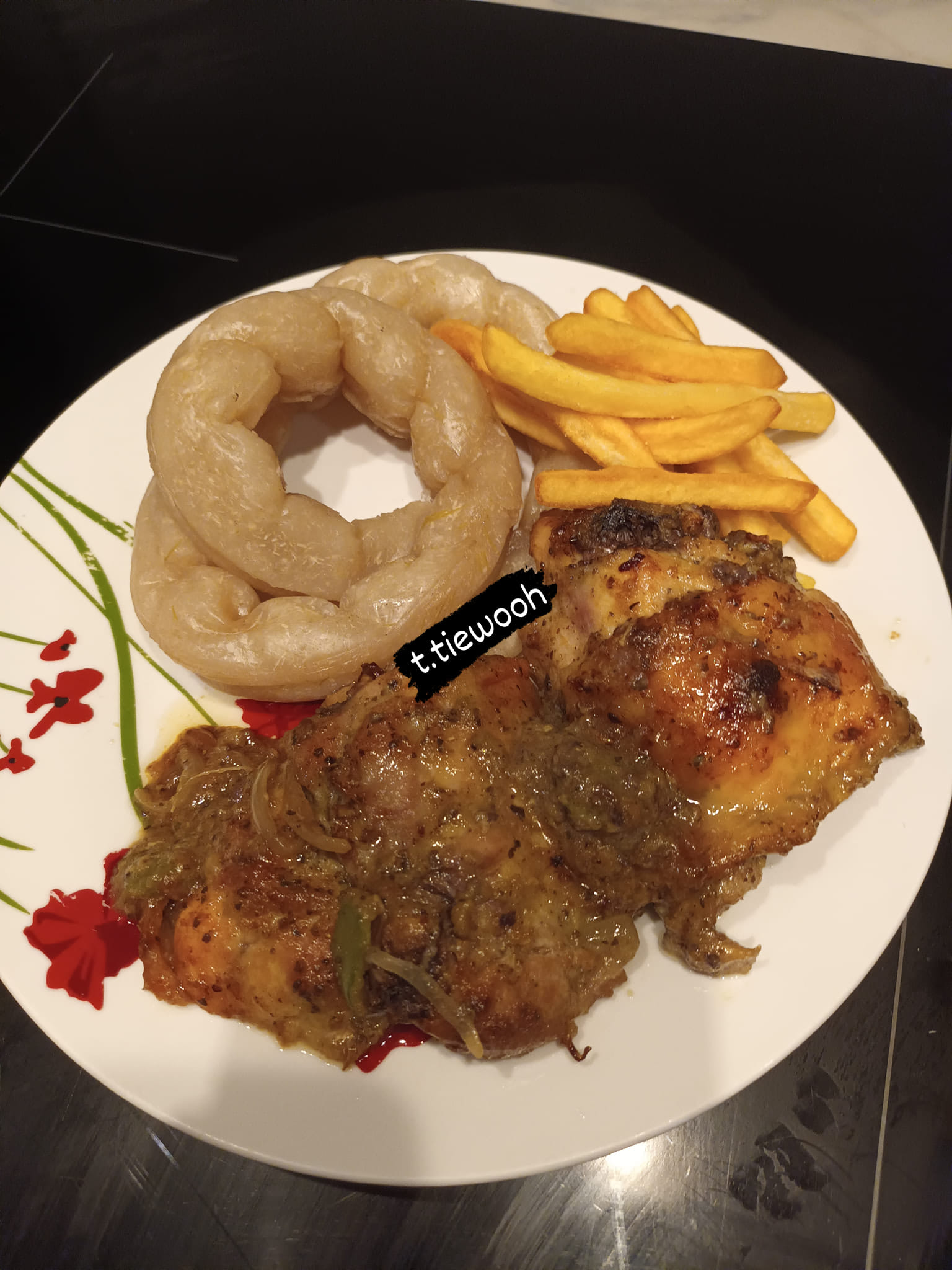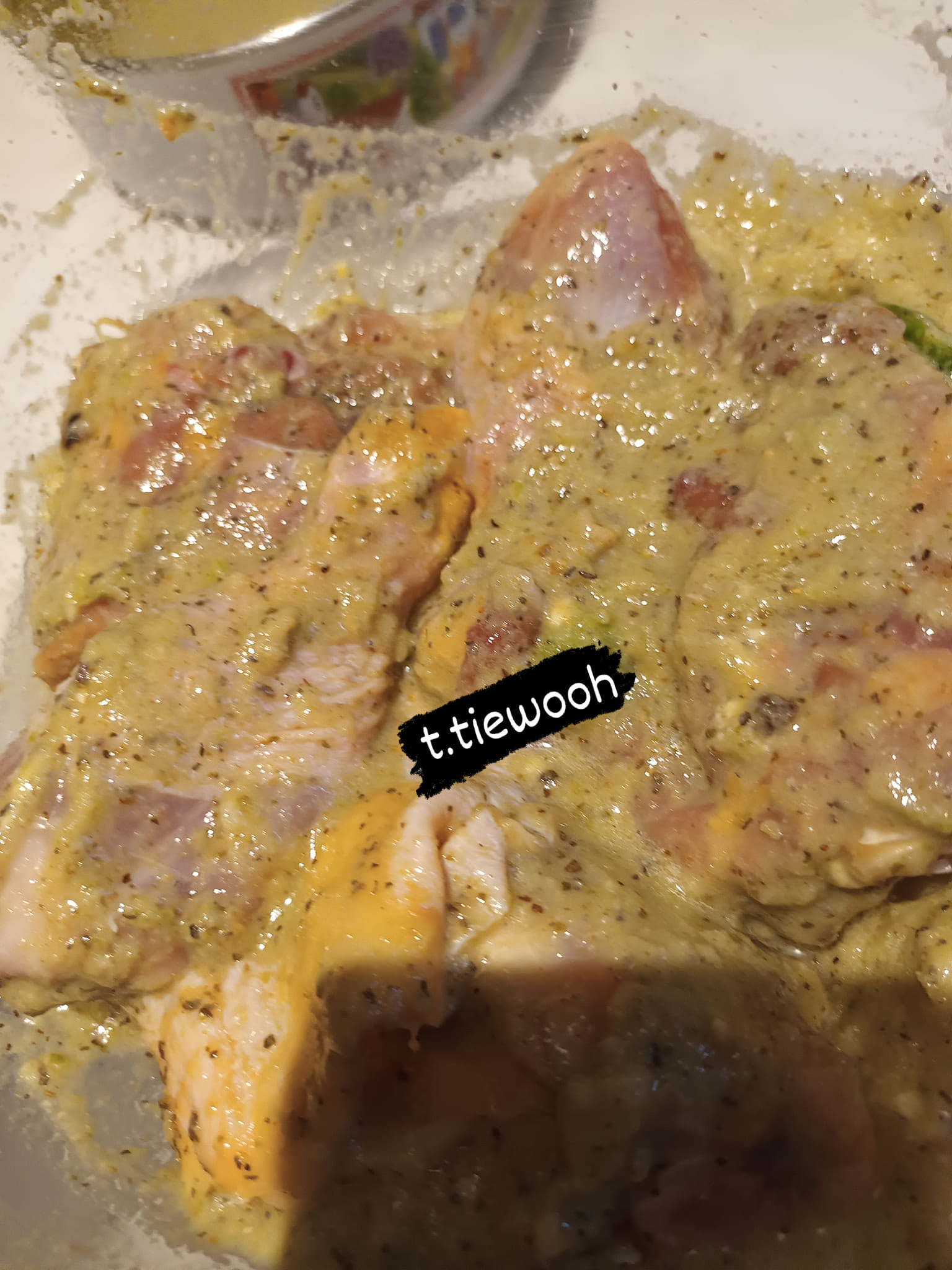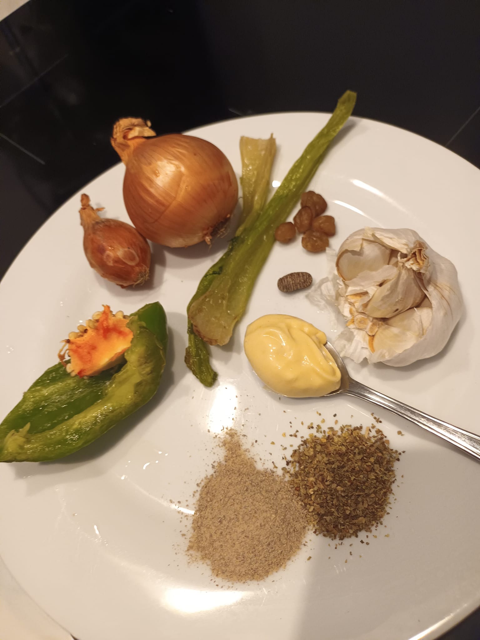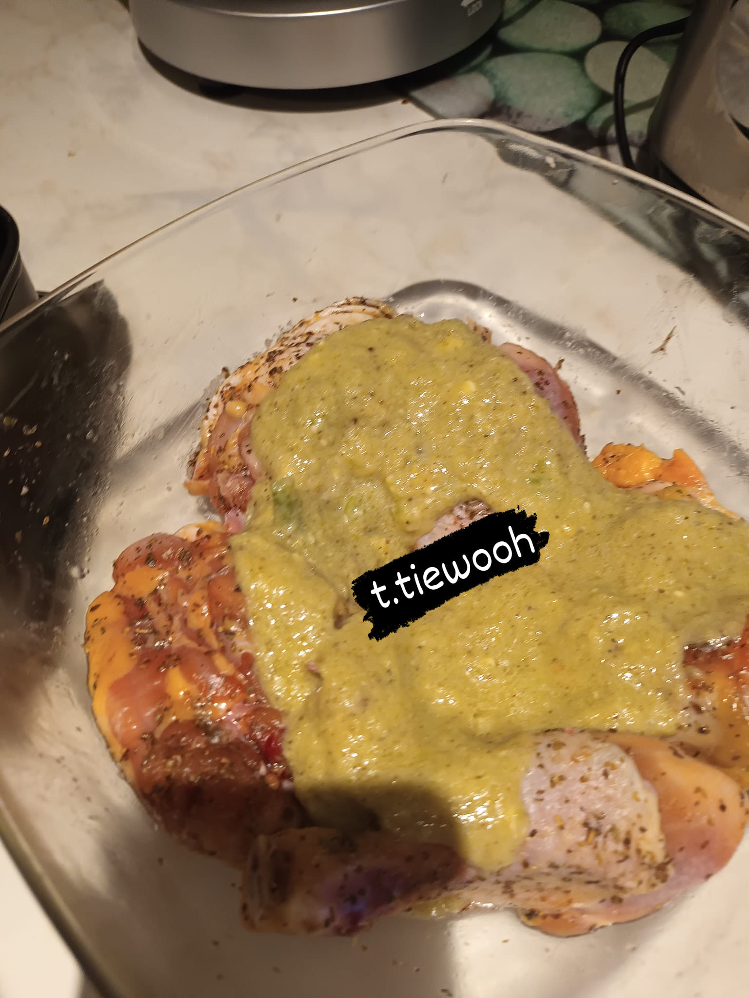 - Écraser, oignon, ail pebe, tige de céleri, poivron ajouter le gingembre, mayonnaise, un peu d’huile, sel et cube, bien mélanger et verser sur les poulets, bien badigeonner et laisser reposer 2h au frais.