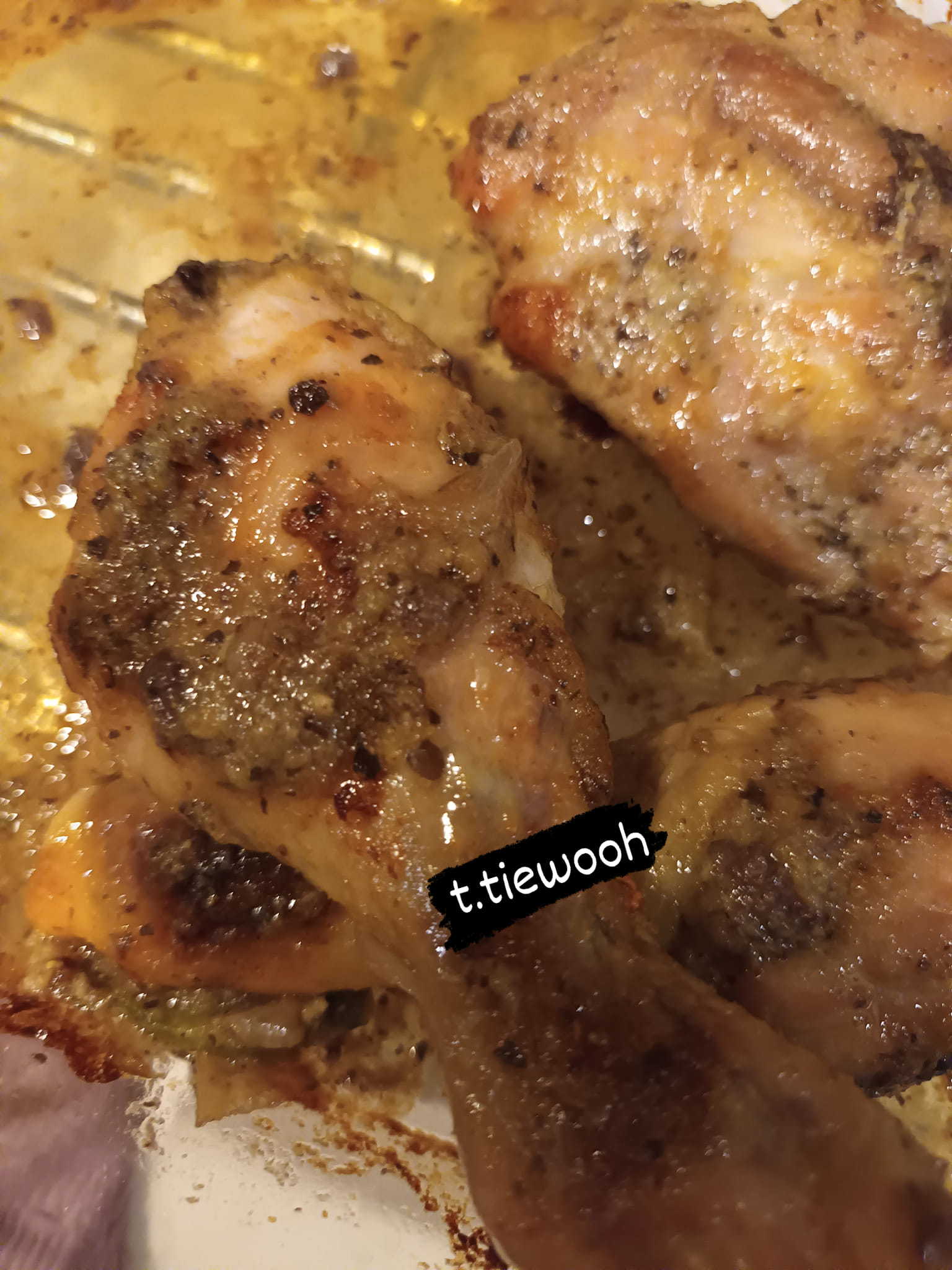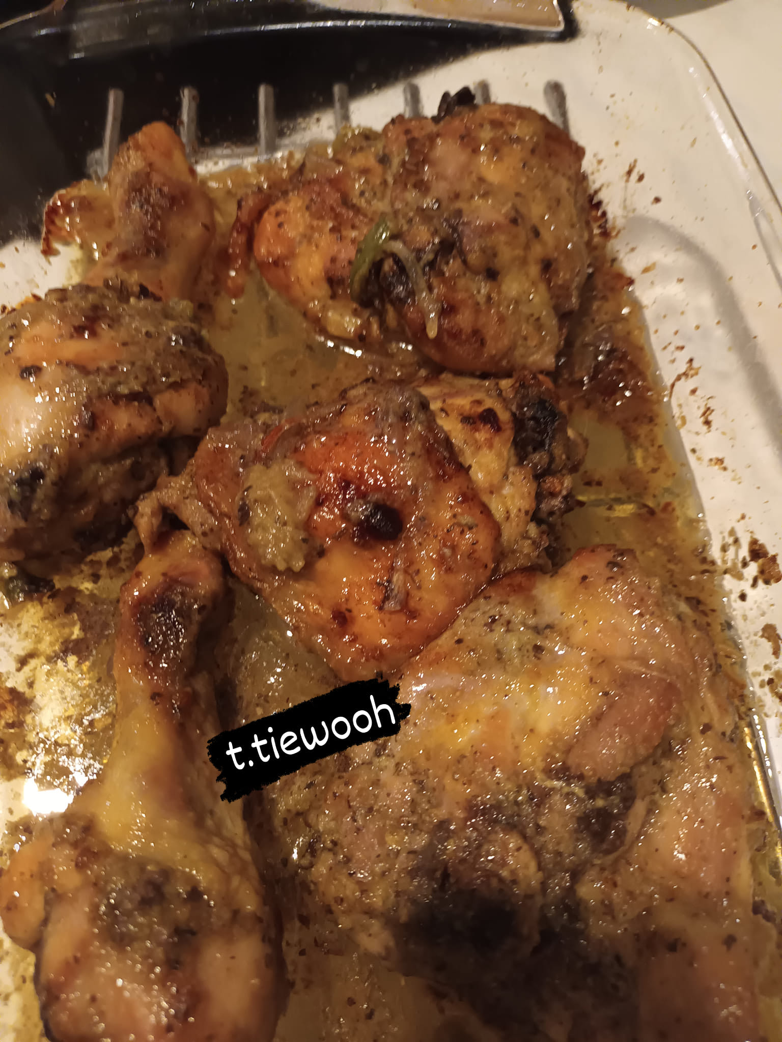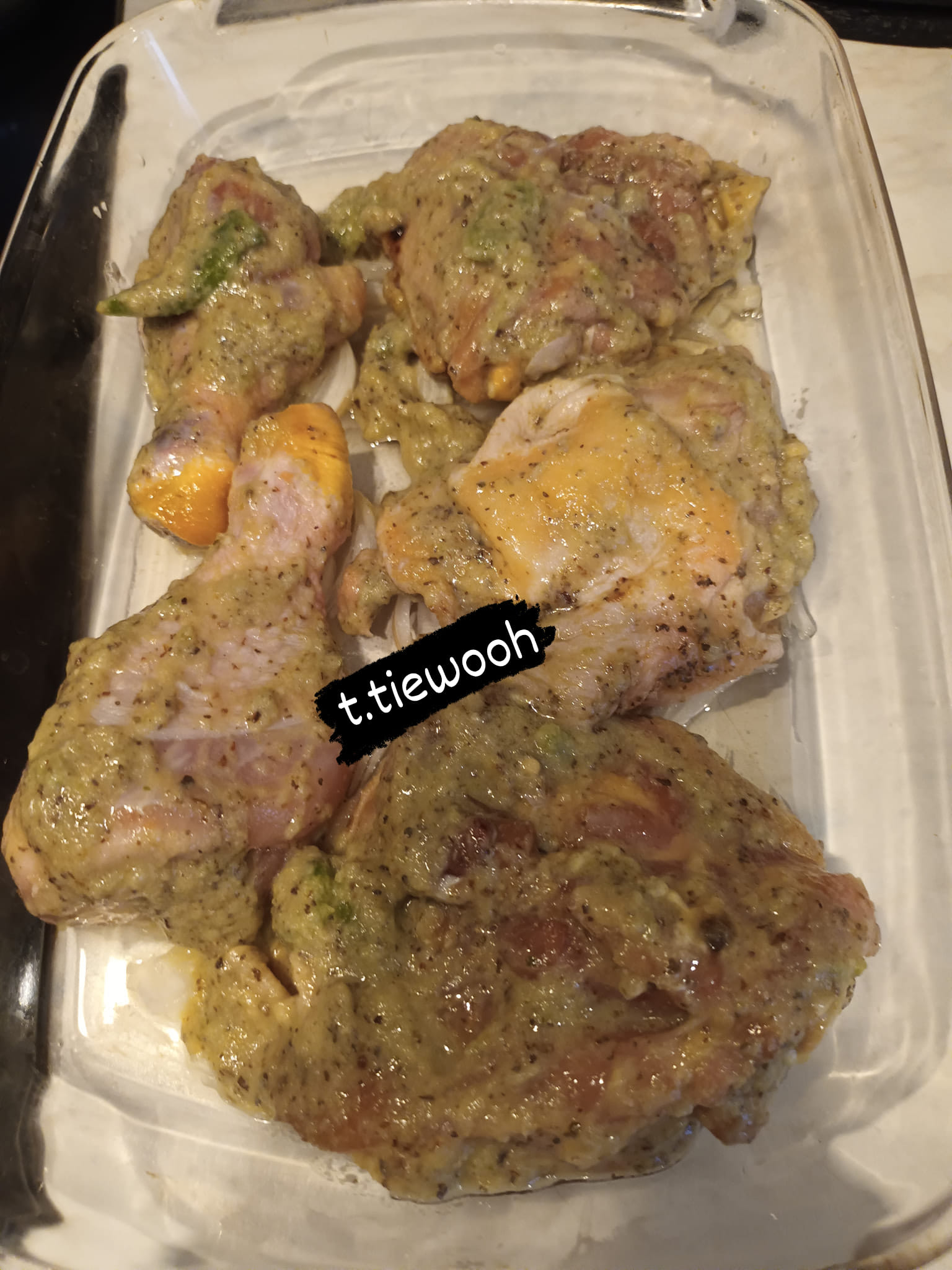 - Tapisser votre plat du four avec des oignons, un filet d’huile et déposer vos morceaux de poulet , asperger d’un peu de marinade.
