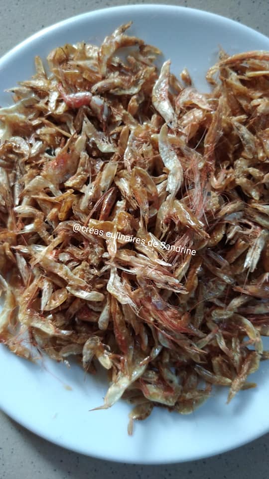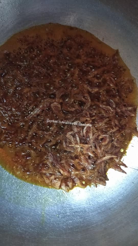 Ajouter les crevettes séchées ,frire ensemble pour laisser sa saveur bien s’imprégner de l’huile