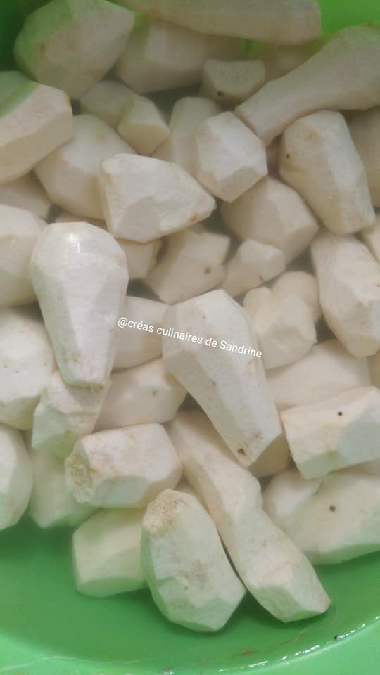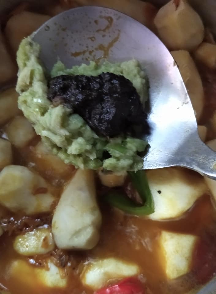 Lorsque le macabo est presque cuit ajouter les ingrédients écrasés oignons , gingembre, basilic ( lorsque le basilic est écrasé il devient noir ) mélanger le tout laisser mijoter et c’est prêt