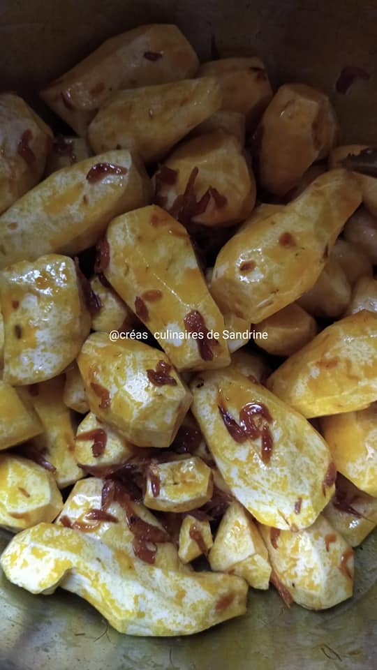 Lorsque les crevettes ont bien grillé avec l’huile ajouter le macabo saler et mélanger le tout