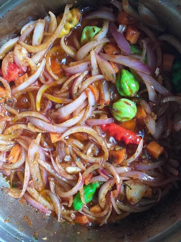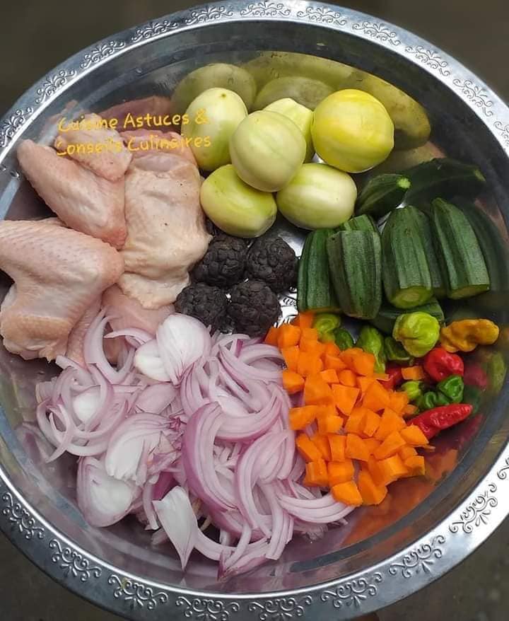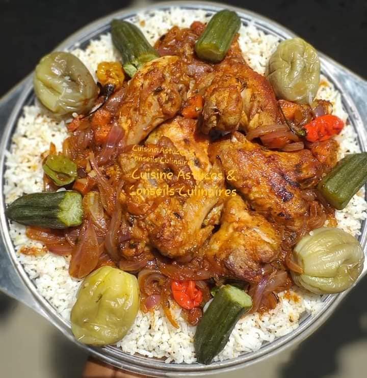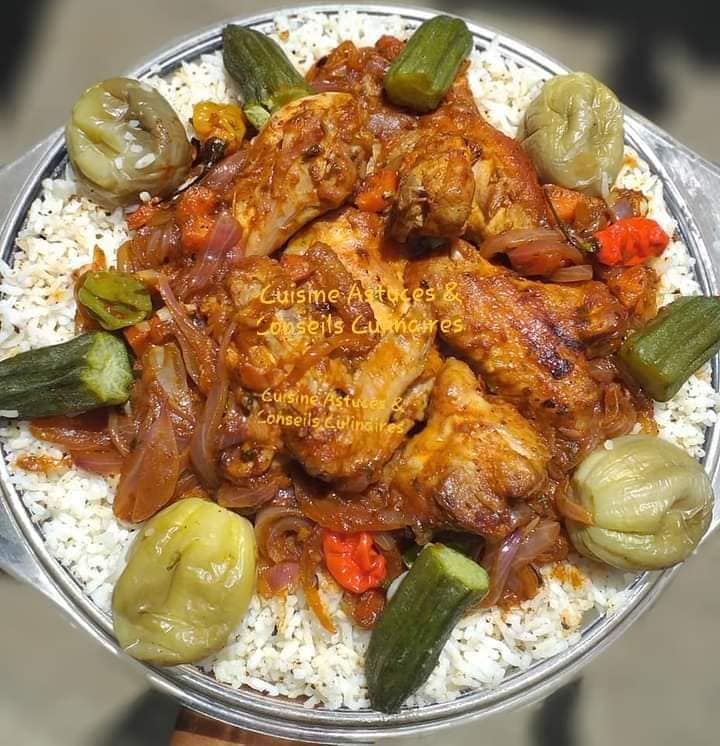 Puis ajouter la sauce au poulet. Les gombos et aubergines au dessus se mangent avec le riz pendant la dégustation ce n’est pas juste de la déco.