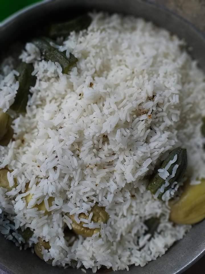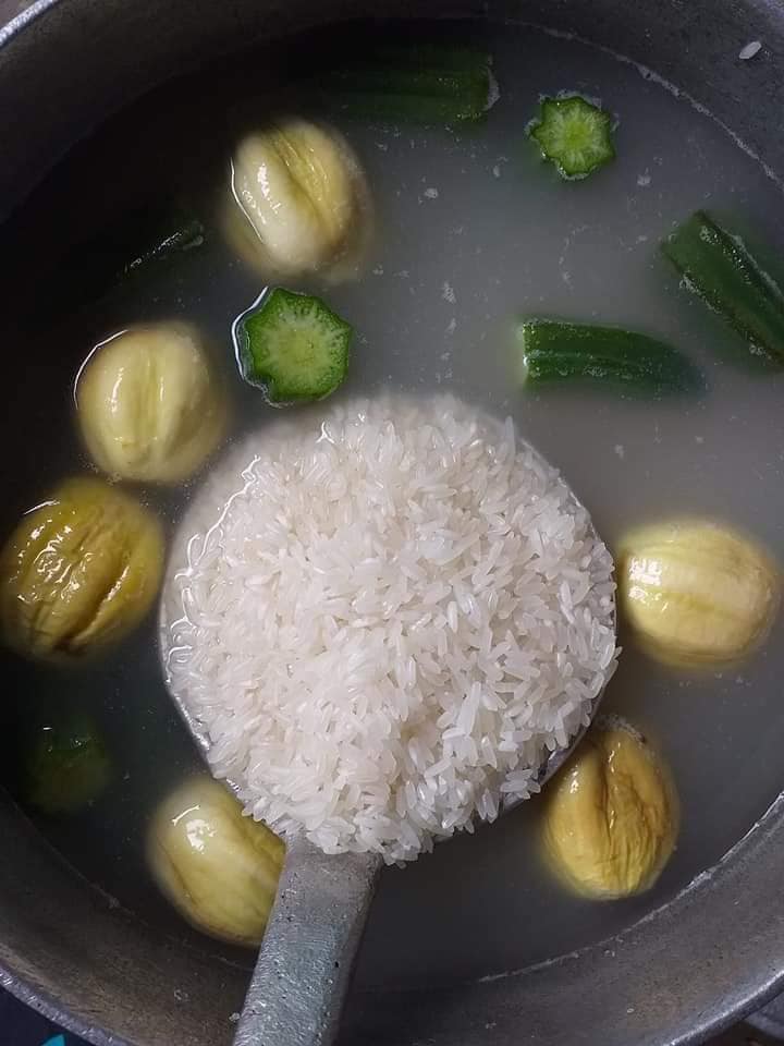 Commencez par mettre l’eau dans une casserole et déposer sur le feu, ajoutez y les gombos, aubergines et sel.