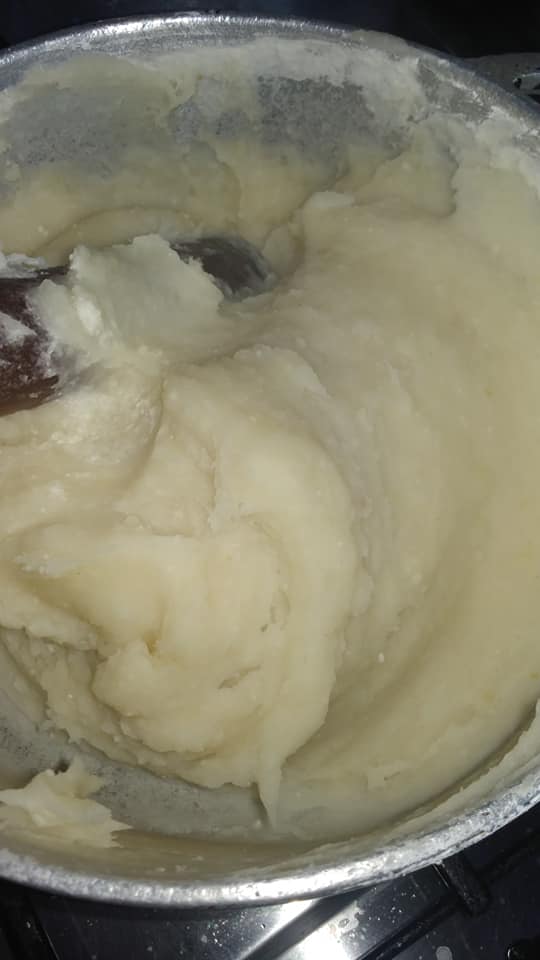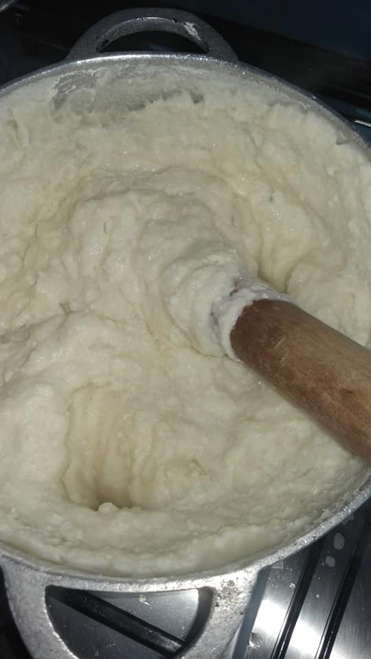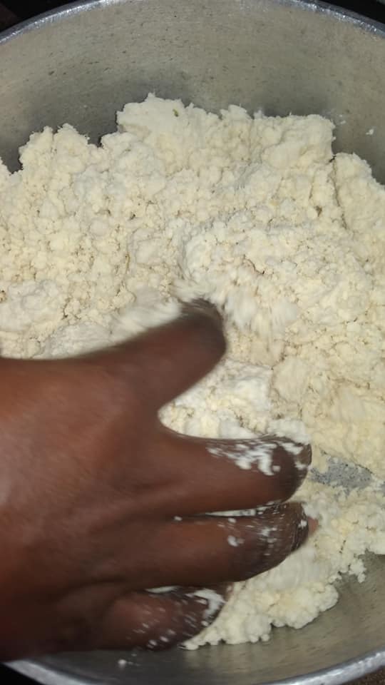 - Pétrir son water fufu avec de l’eau puis mettre au feu et commencer à tourner jusqu’a cuisson du foufou. (Confère images)