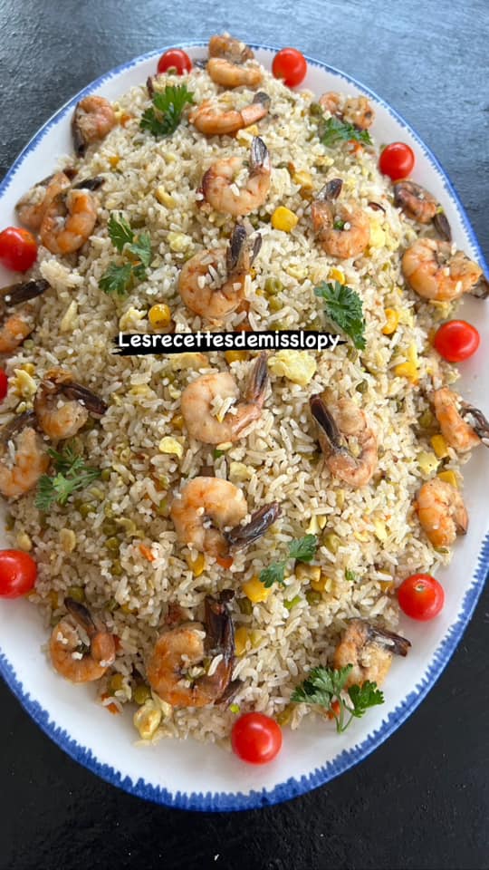 - Bien sautées juste 5 minutes ajoutez les grains de maïs et les petits pois égouttés puis ajoutez le riz cuit et enfin les dés de feuilles d’oignon.