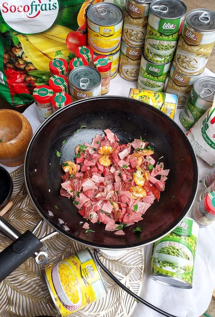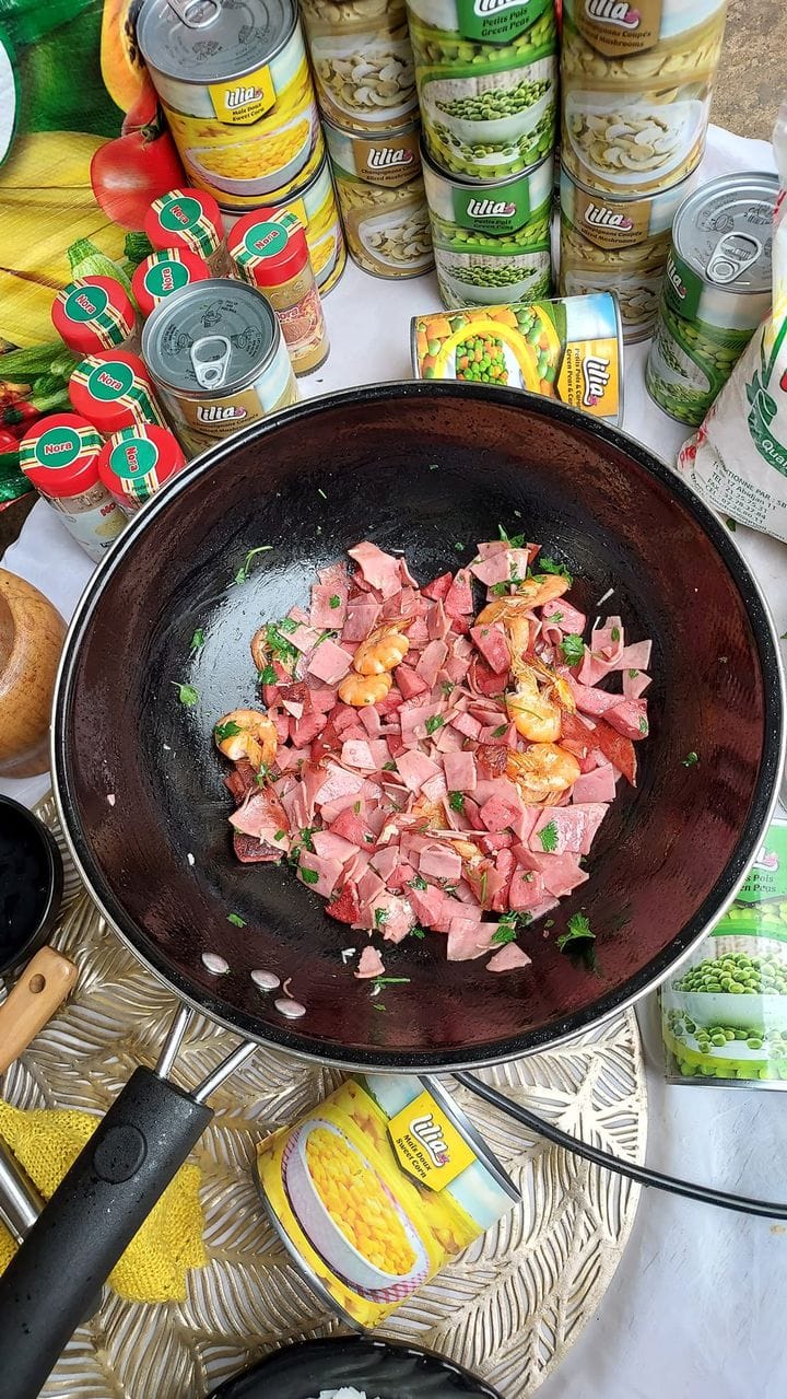 Faites revenir dans un filet d’huile les crevettes, jambon, saucisson découpés en dés. Laissez mijoter pendant quelques minutes tout en remuant.