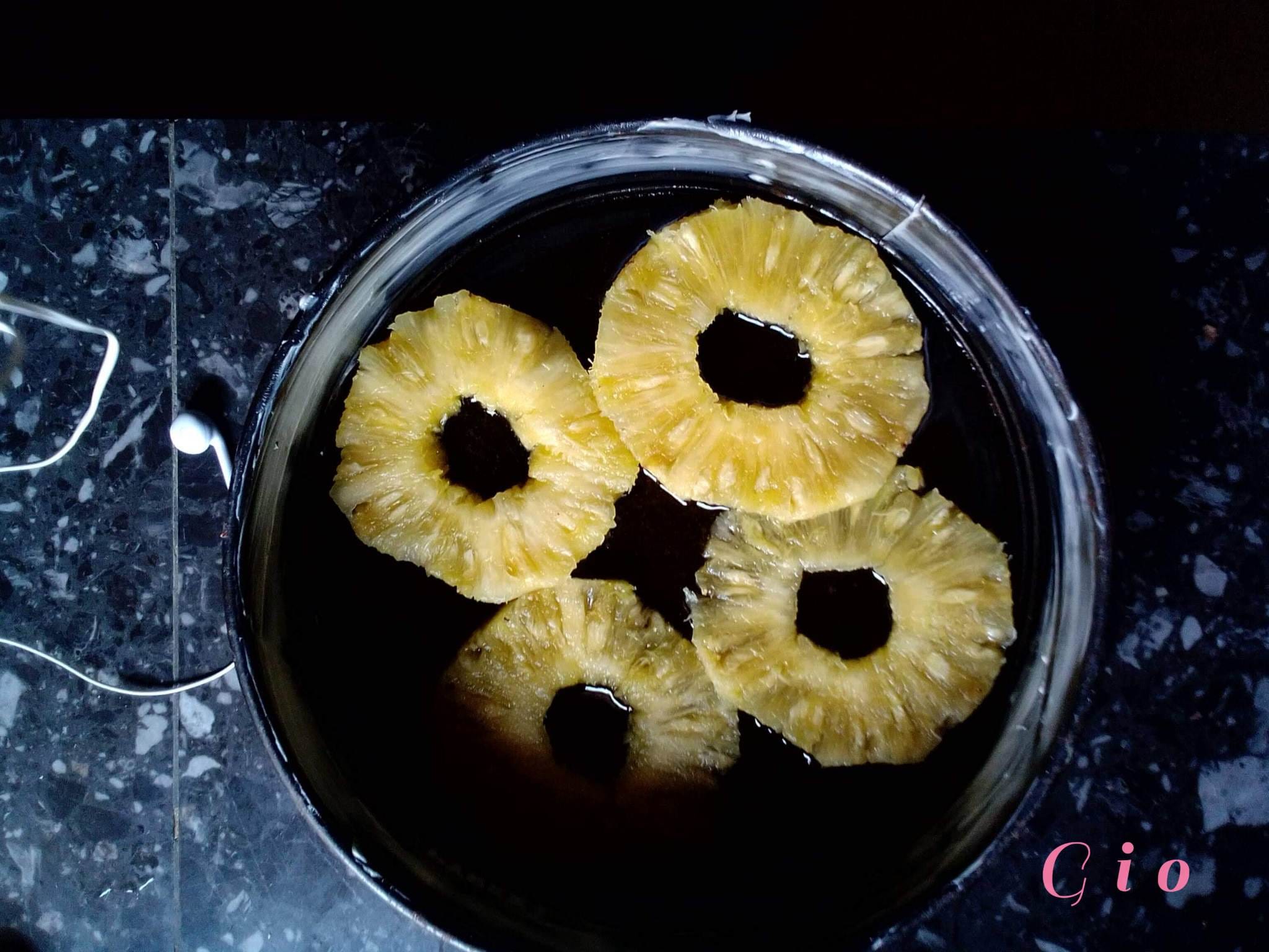 7. Récupérez votre moule et disposez vos tranches d’ananas au dessus de votre caramel.