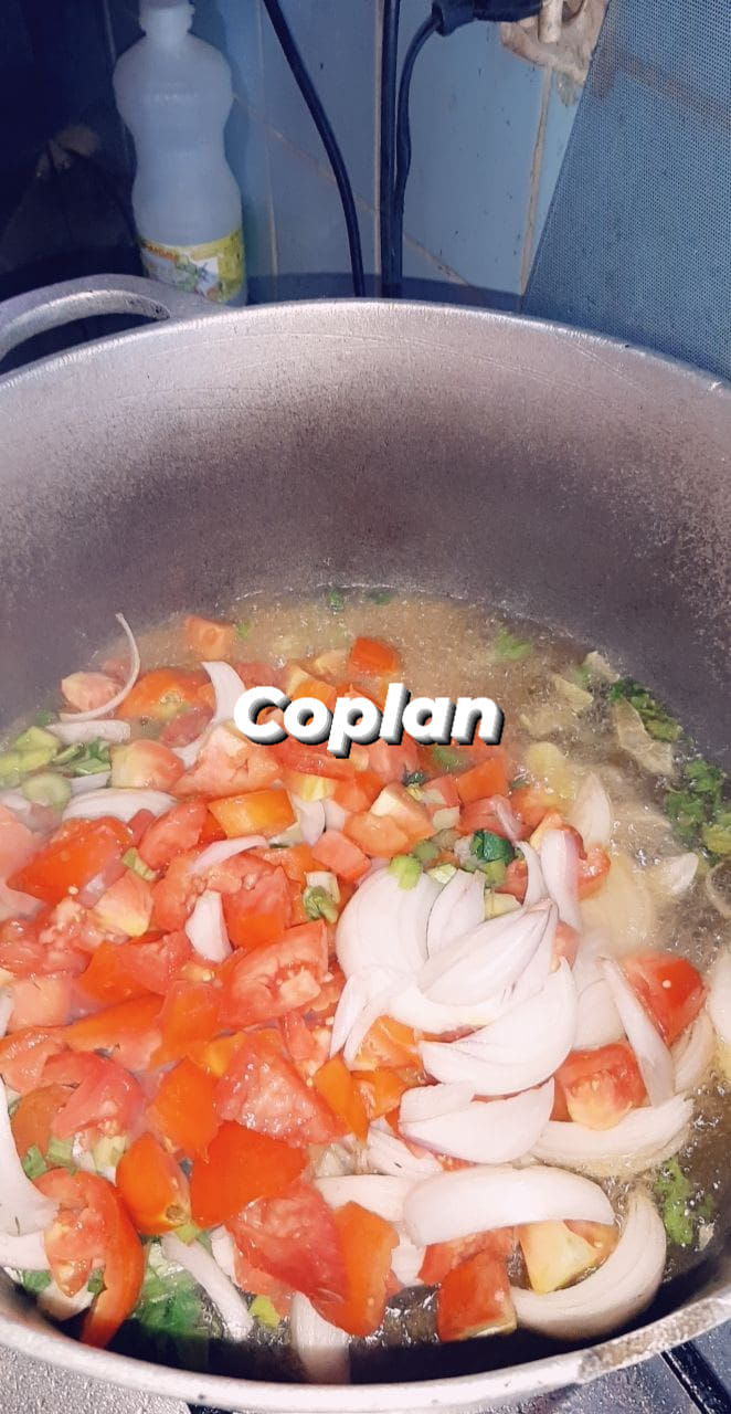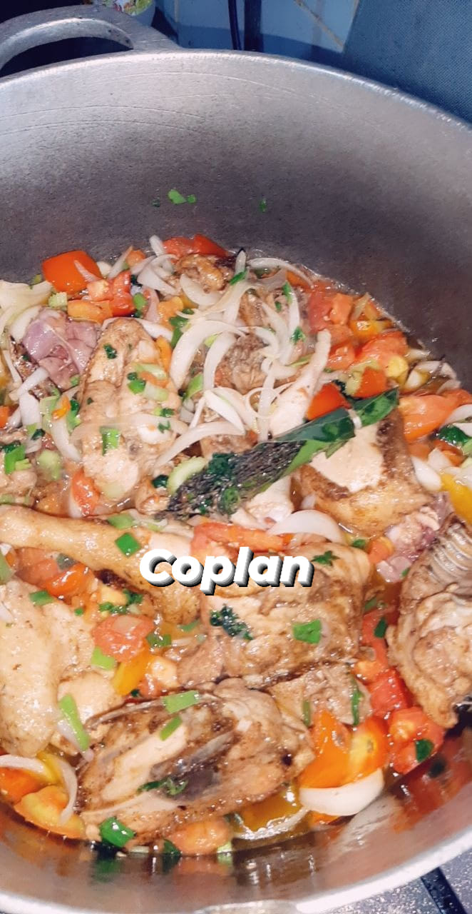 - Chauffer de l’huile dans une cocotte et faire revenir 2 oignons émincés puis ajouter les tomates, les condiments verts 2 piments jaunes le tout haché, le gingembre. Saler poivrer. Remuer la sauce a l’aide d’une spatule, laisser cuire à feu moyen pendant 3 minutes. Ajouter le poulet, l’imprégner de sauce… Encore 5 à 10 minutes à feu vif.