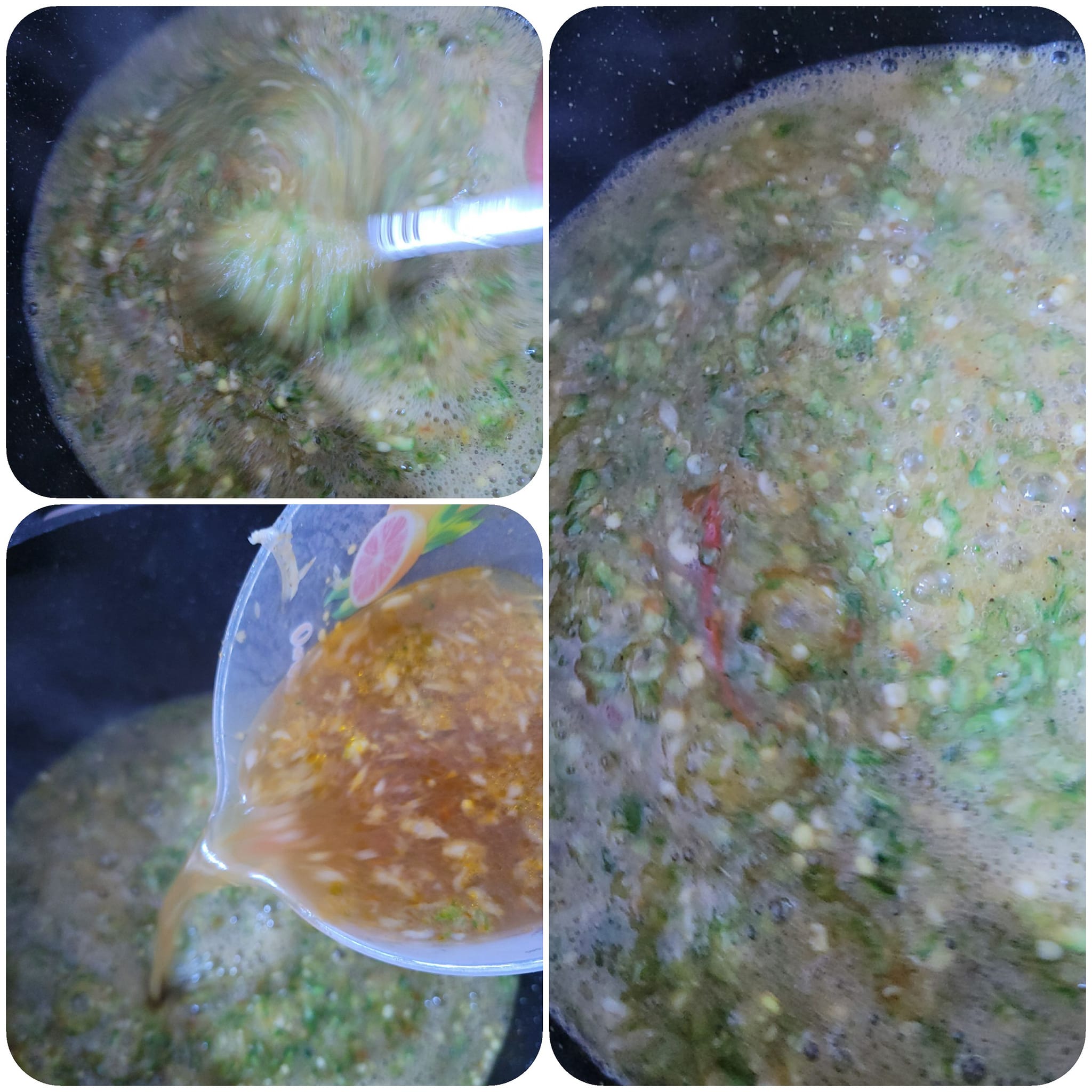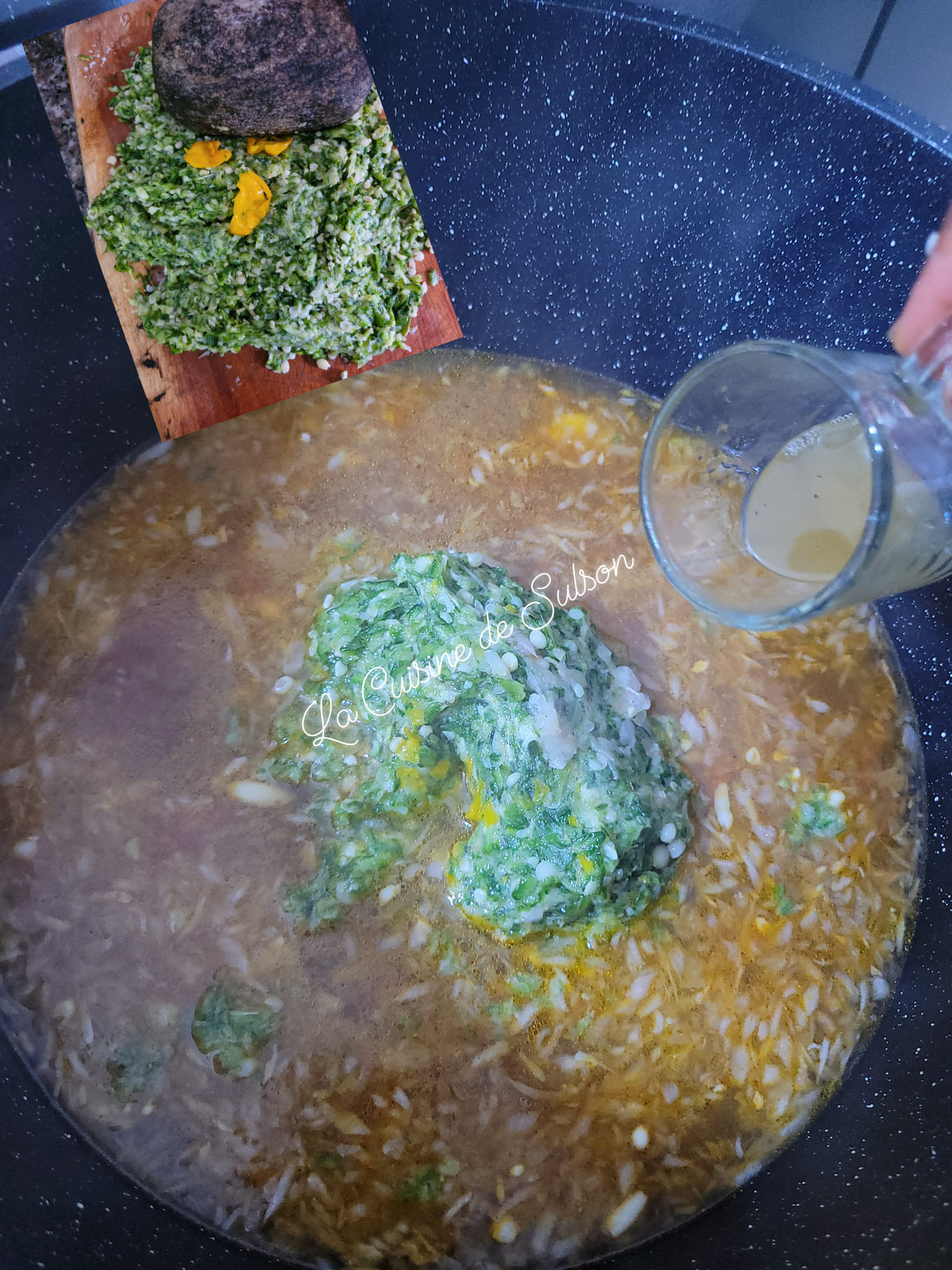 Puis ajouter le gombo râpé qu’on aura fait passer à la pierre ou au mortier légèrement. Mettre aussi un peu de sel gemme dilué ou 1Cs de dalang ou du bicarbonate.