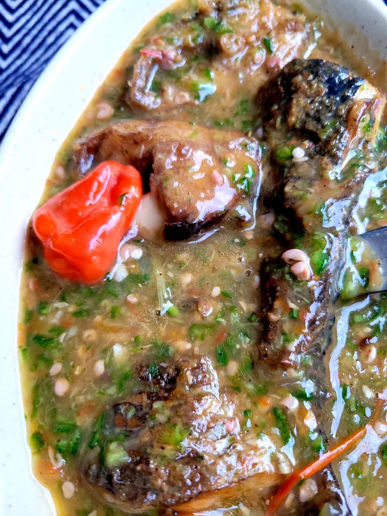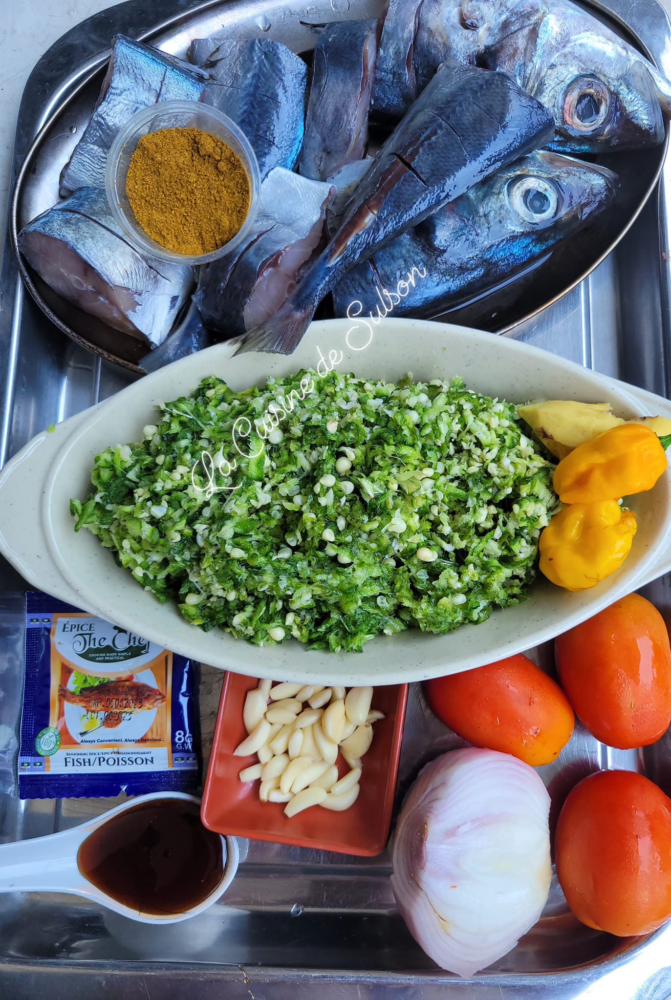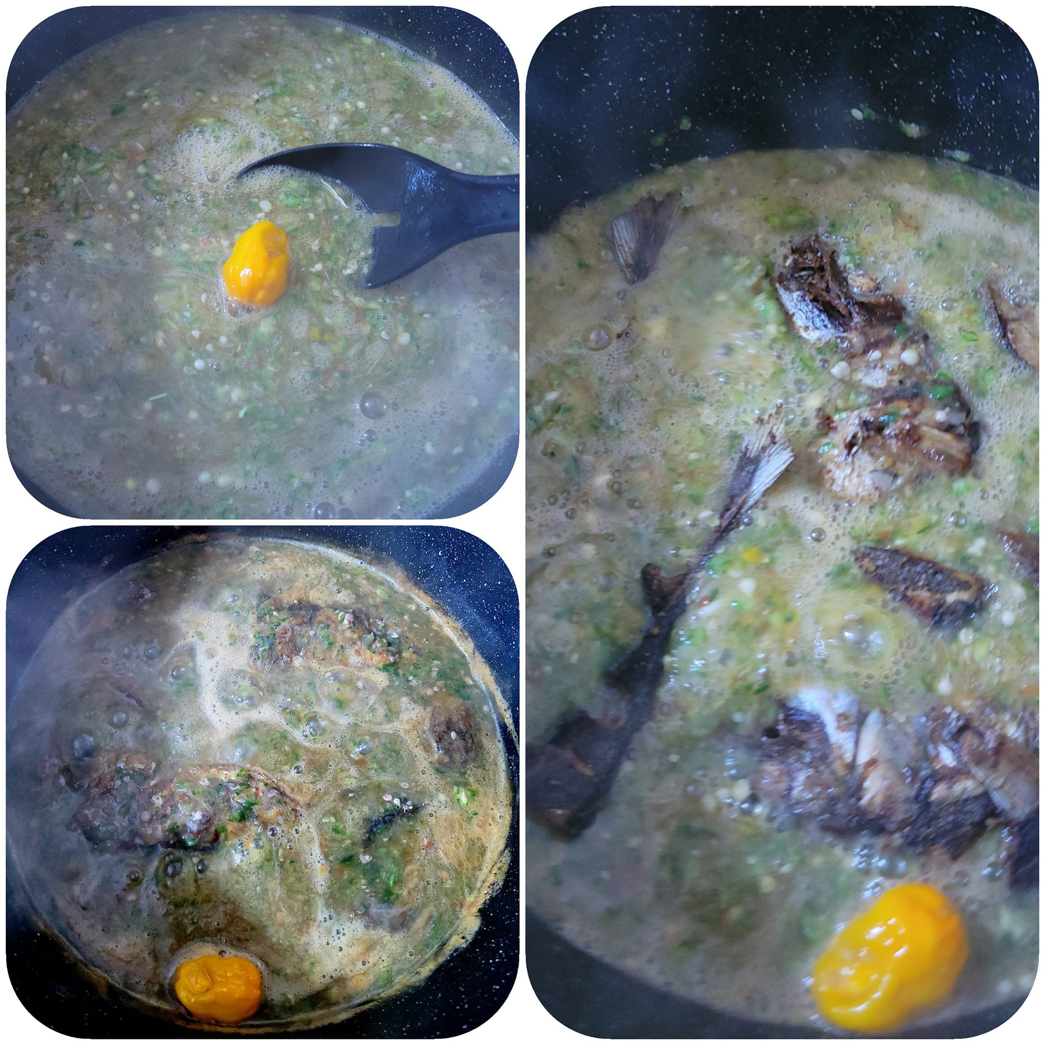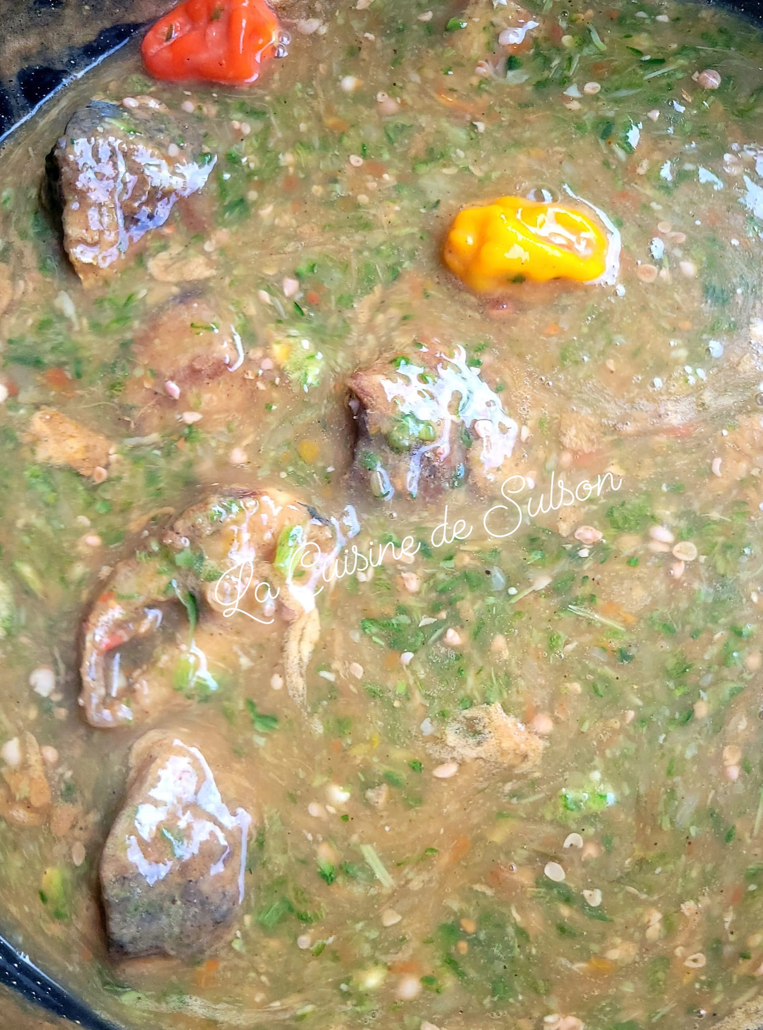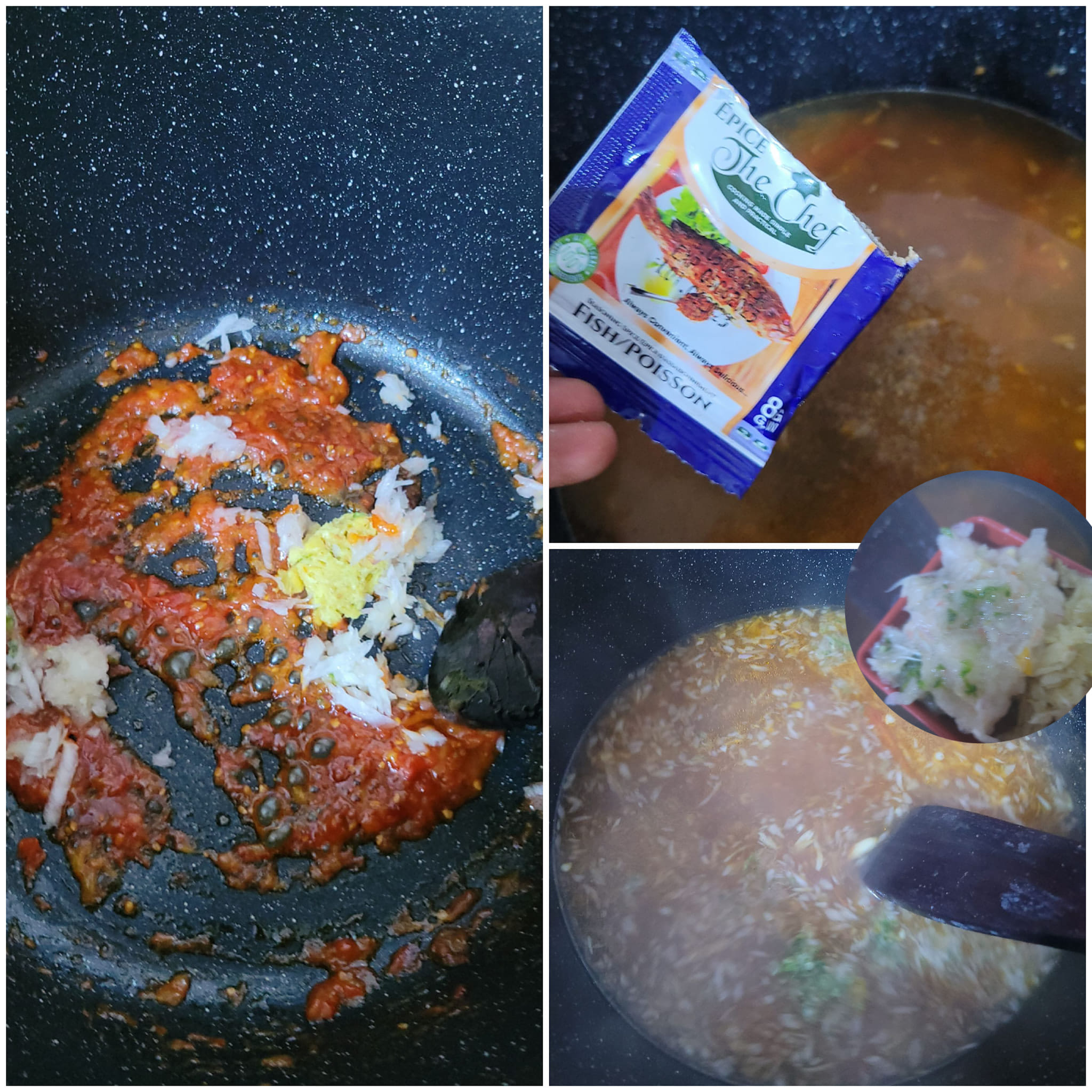 Puis ajouter le gingembre écrasé avec un peu d oignon et d ail râpé ou écrasé. Laisser 5minutes.puis ajouter eau sel et Epice the Chef . Laiser bouillir 5autres minutes puis ajouter le reste d oignon et d ail écrasés grossièrement