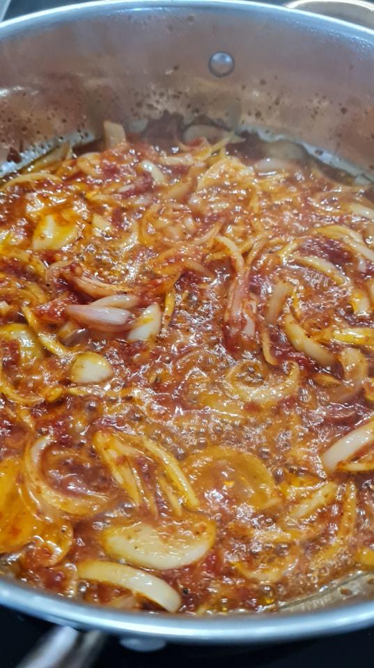 - Incorporez les 2 cuillères à café de concentré de tomate aux oignons.