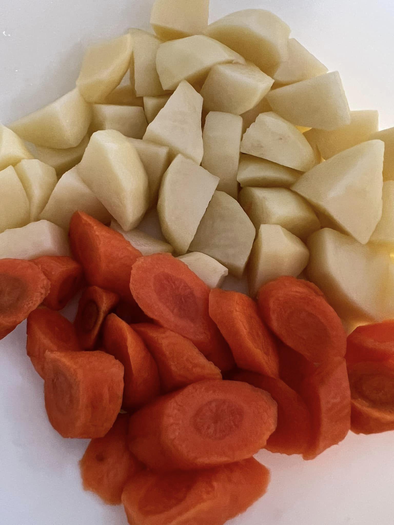 - Ajoutez les pommes de terre et les carottes coupées en morceaux ; laissez cuire pendant 10 minutes.