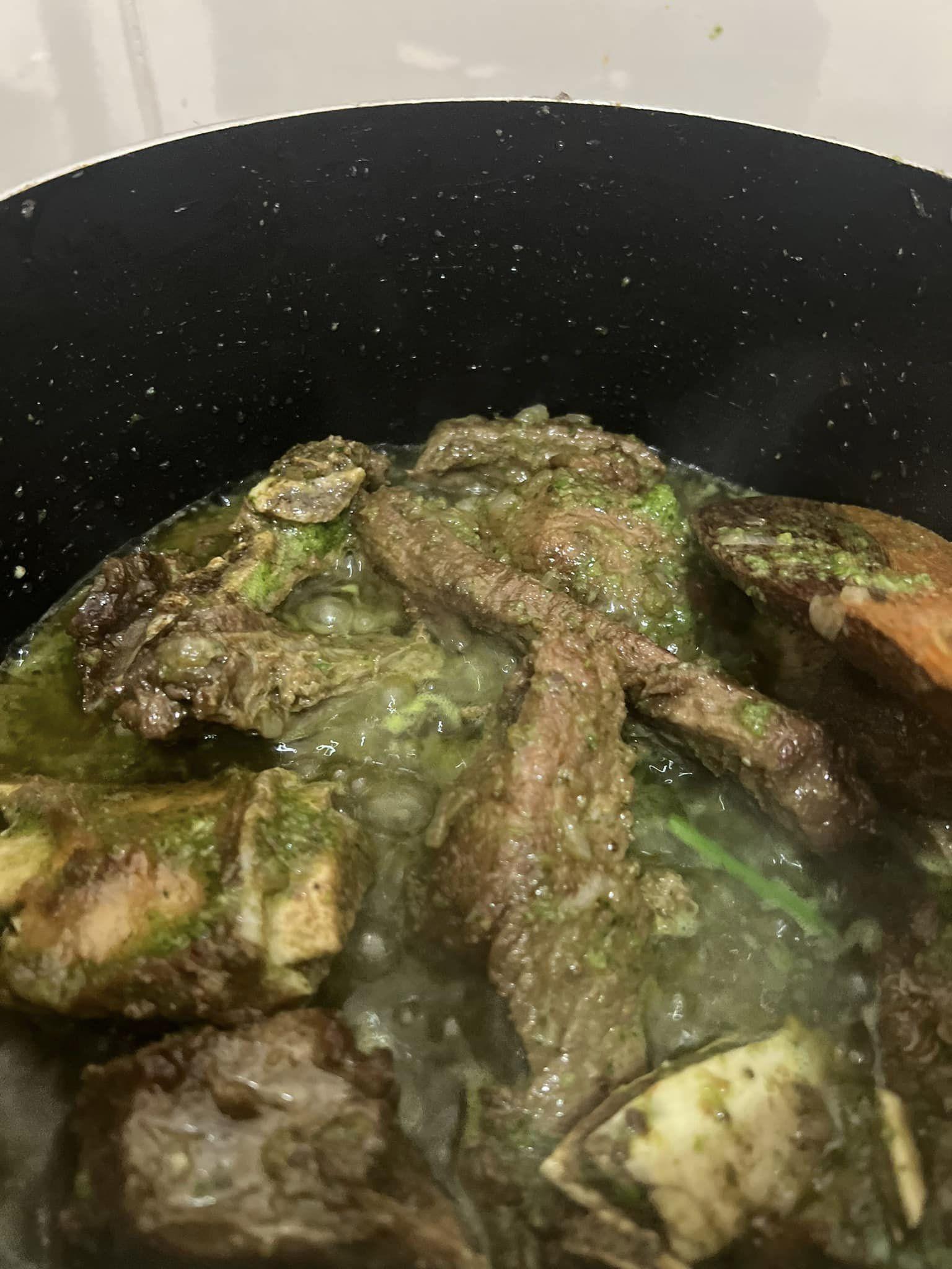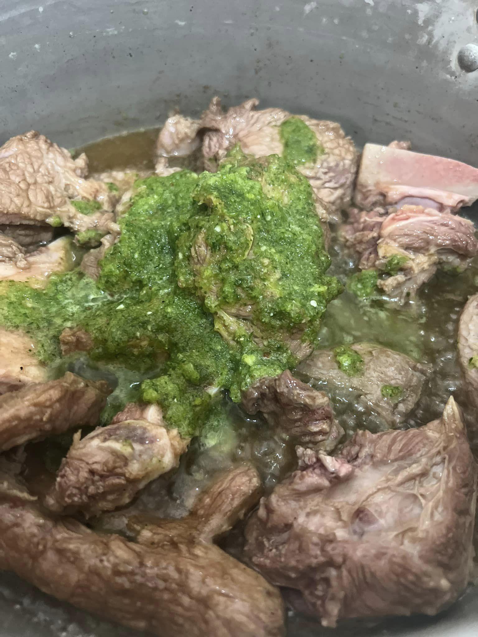 - Incorporez 2 cuillères à soupe de l’assaisonnement vert et un stick de bouillon épicé ou du sel selon votre goût.